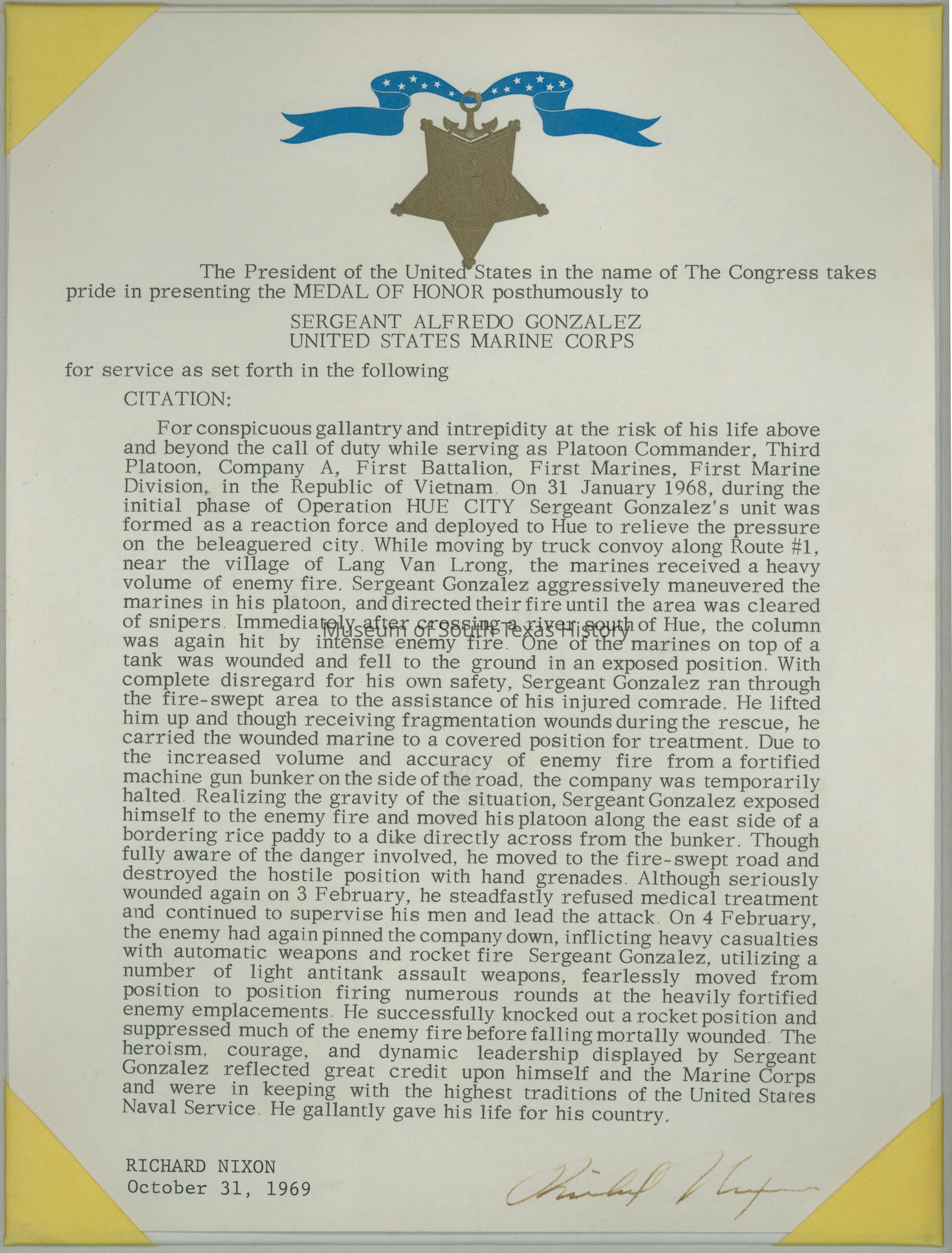 Congressional Medal of Honor citation given to donor's son, Alfredo "Freddy" Gonzalez, who served with the US Marine Corps. Signed by then President Richard M. Nixon.Collection
