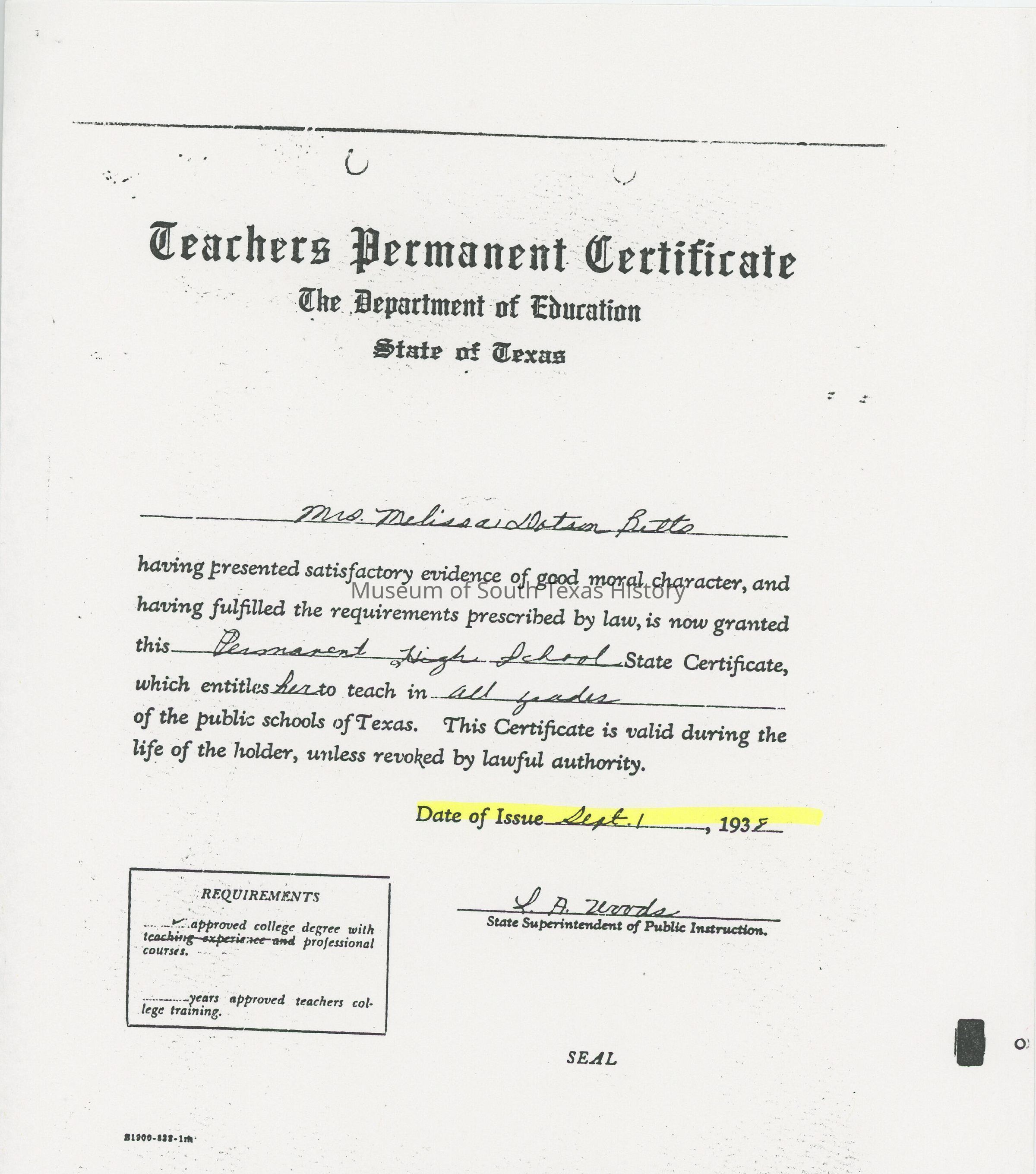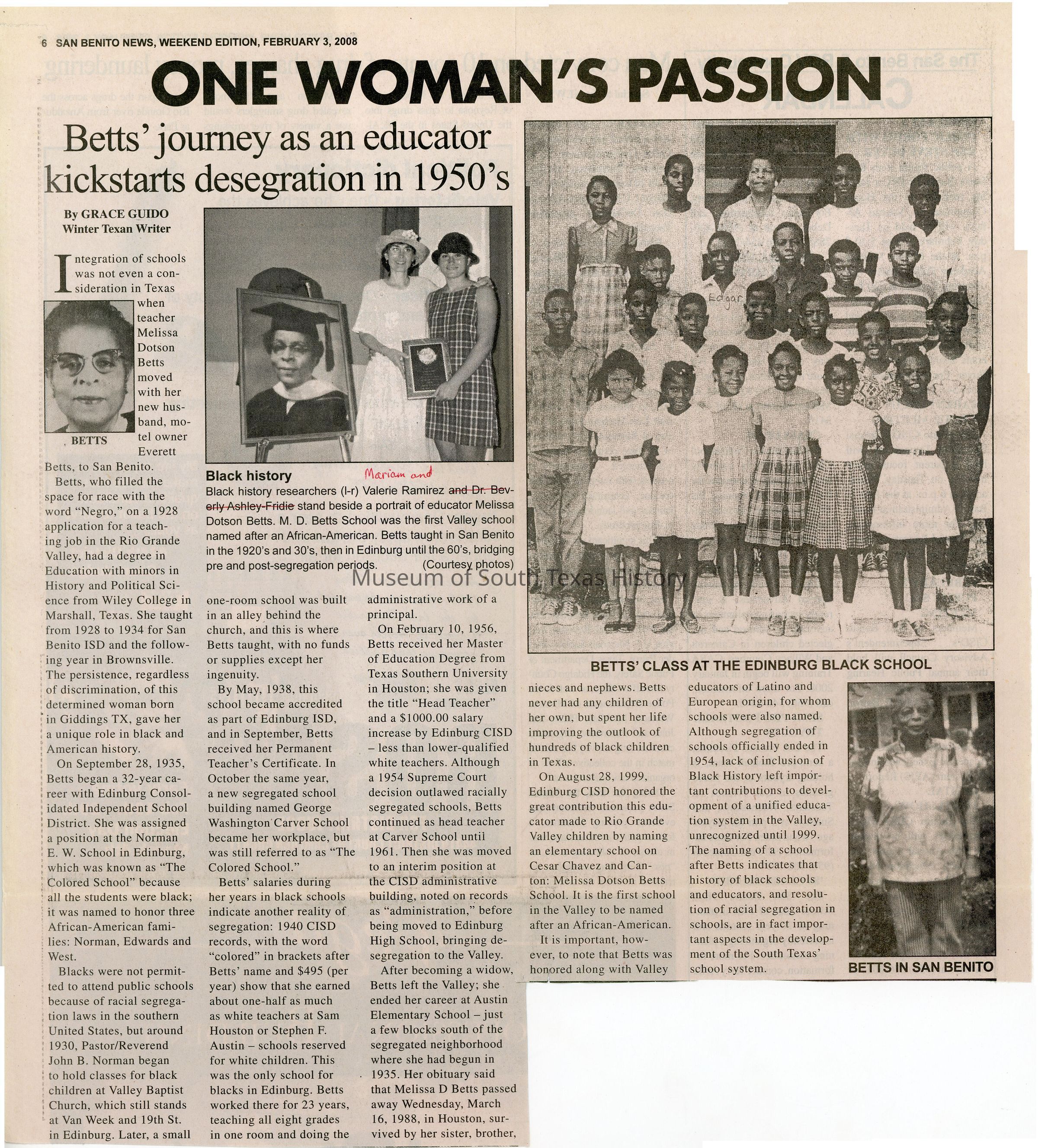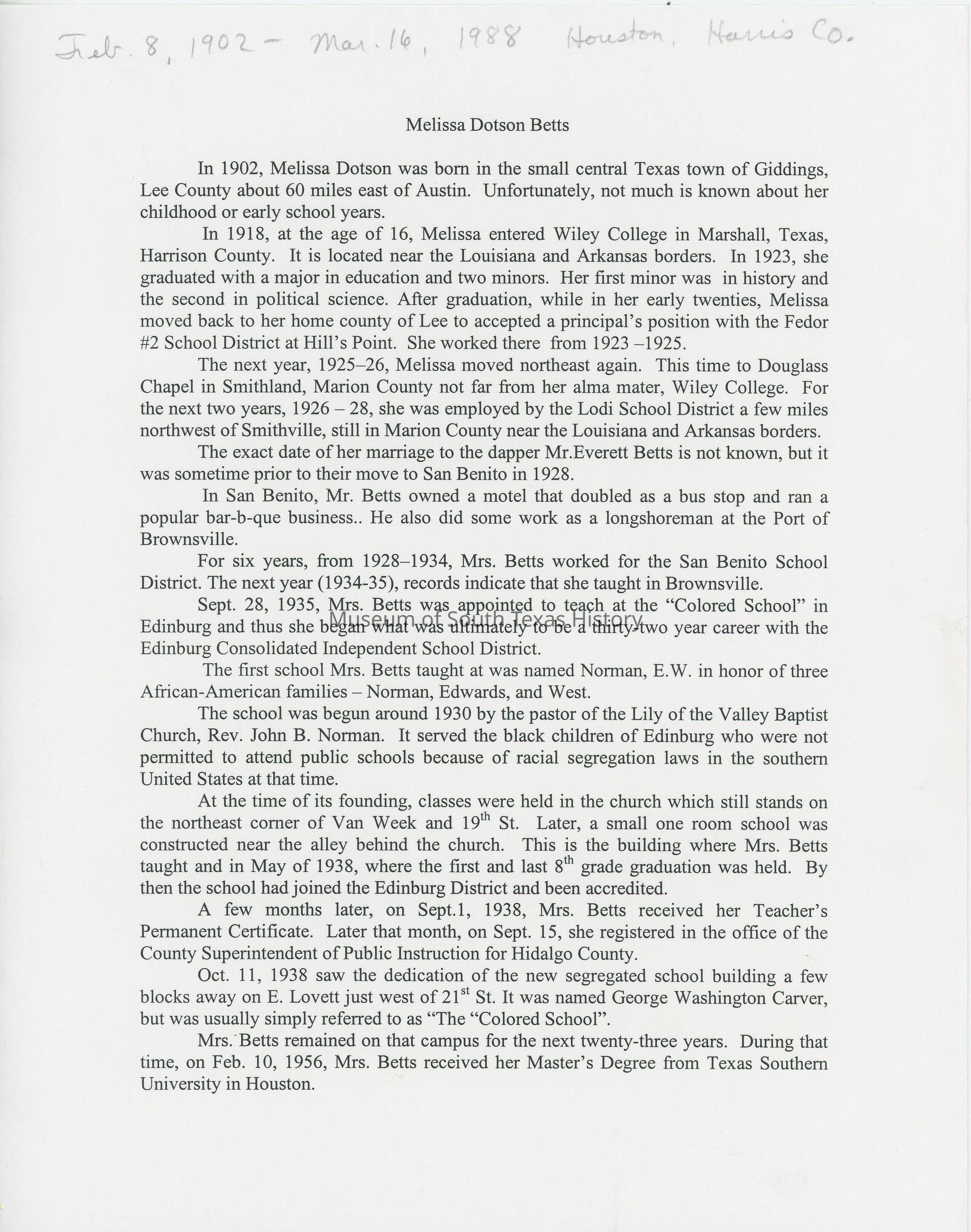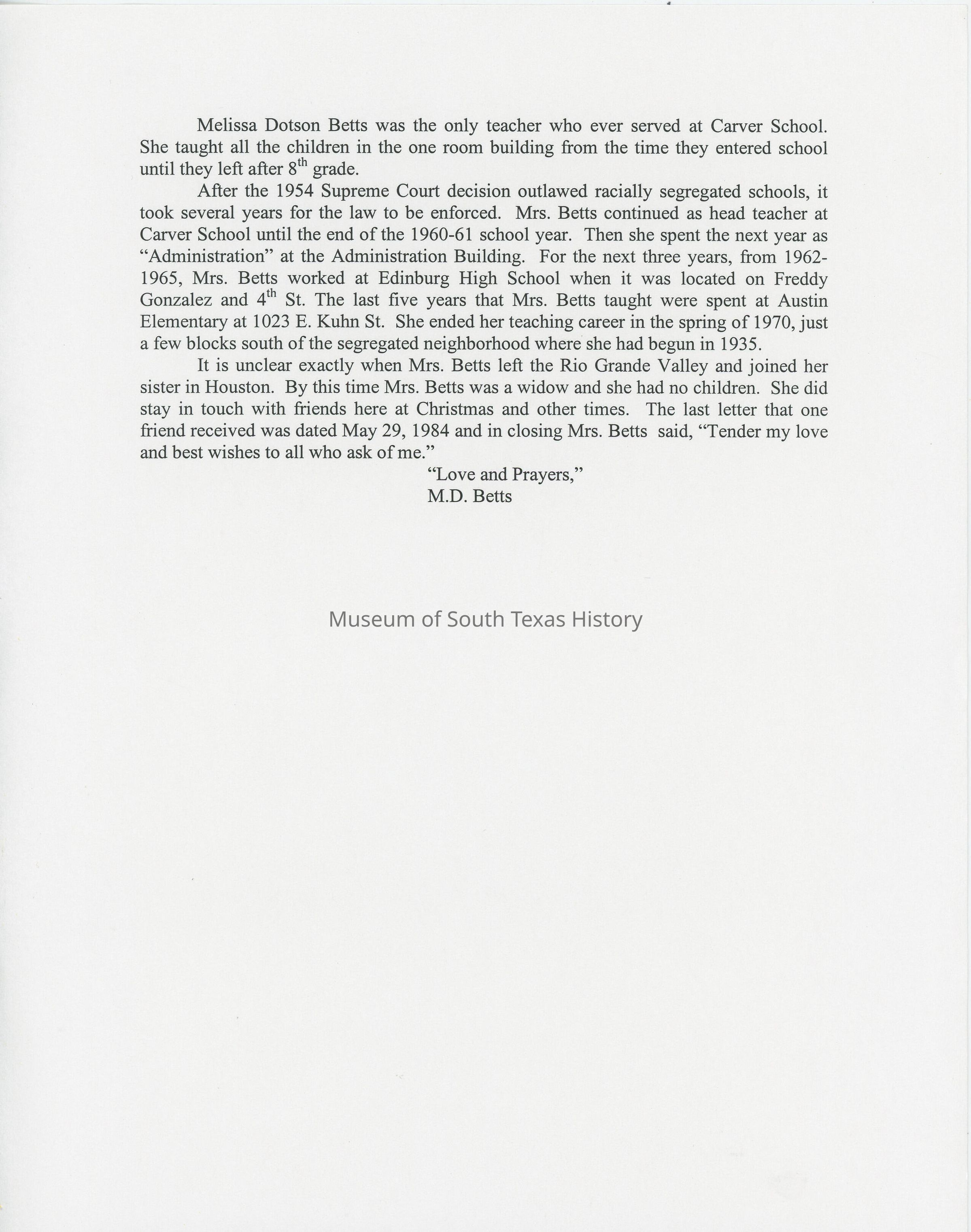 Melissa Betts was a teacher assigned to the "colored school" in Edinburg starting in 1935. She went on to have a 32 year career with the Edinburg Consolidated Independent School District. She was the only staff member to work at the Carver School. Betts Elementary in Edinburg was named in honor of this dedicated educator.Collection