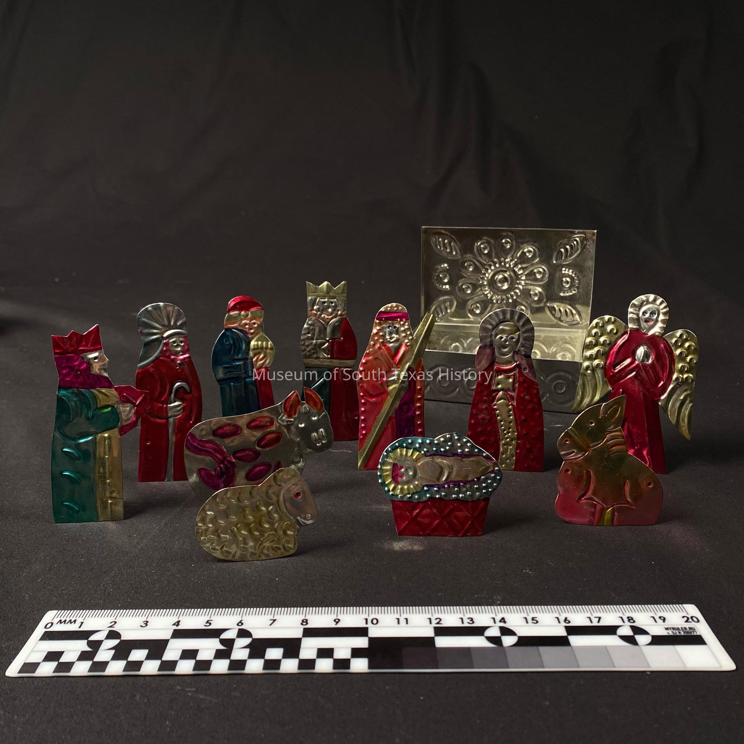 Twelve different colored aluminum figures of the birth of Jesus. A silver box with pattern engravings that holds them inside. Each figure has an engraved pattern on them, the colors on the figures red, green and gold. They are 2-D stands of an Angel, Mary, Joseph, baby Jesus, three Wise Men, a cow, a sheep, a donkey and a fourth man.Context