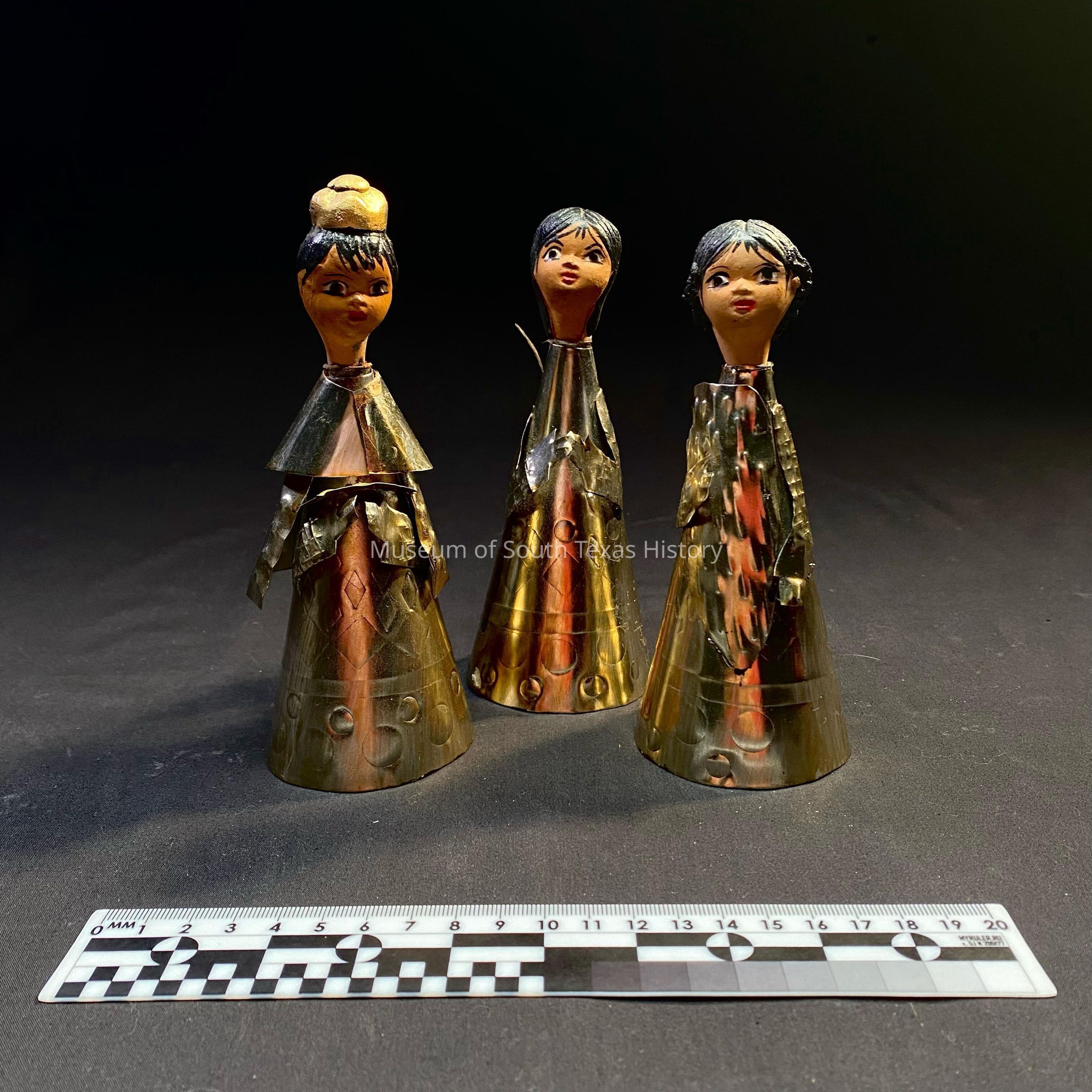 Three aluminum figurine cone base with head at the top painted on.Context