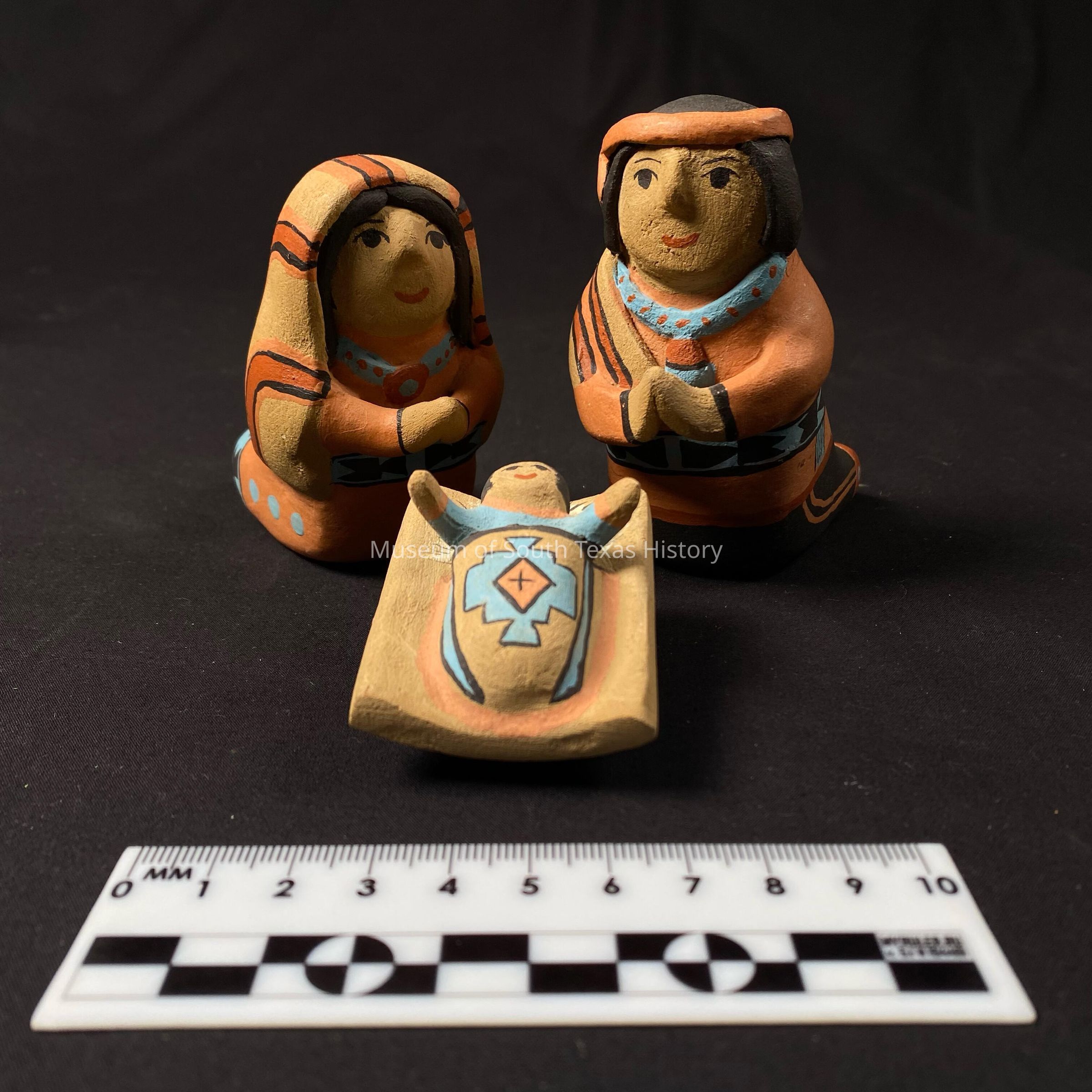 Three ceramic figurines of Joseph, Mary, and baby Jesus having a native wardrobe. Each figurine written is "D.C. San Felipe N.M." on the bottom.Context