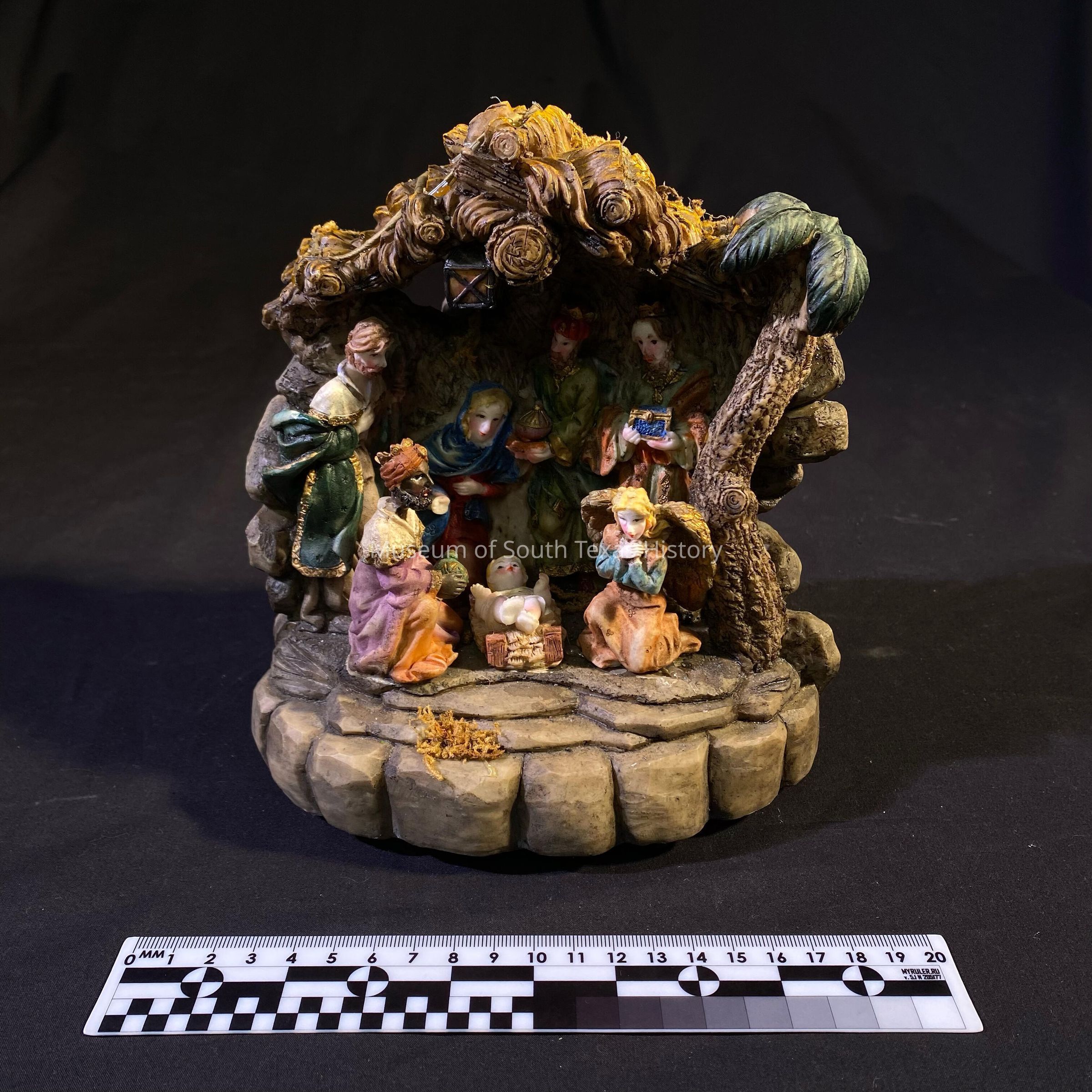 Ceramic nativity figurine that lights and plays music, with the birth of Jesus.Context