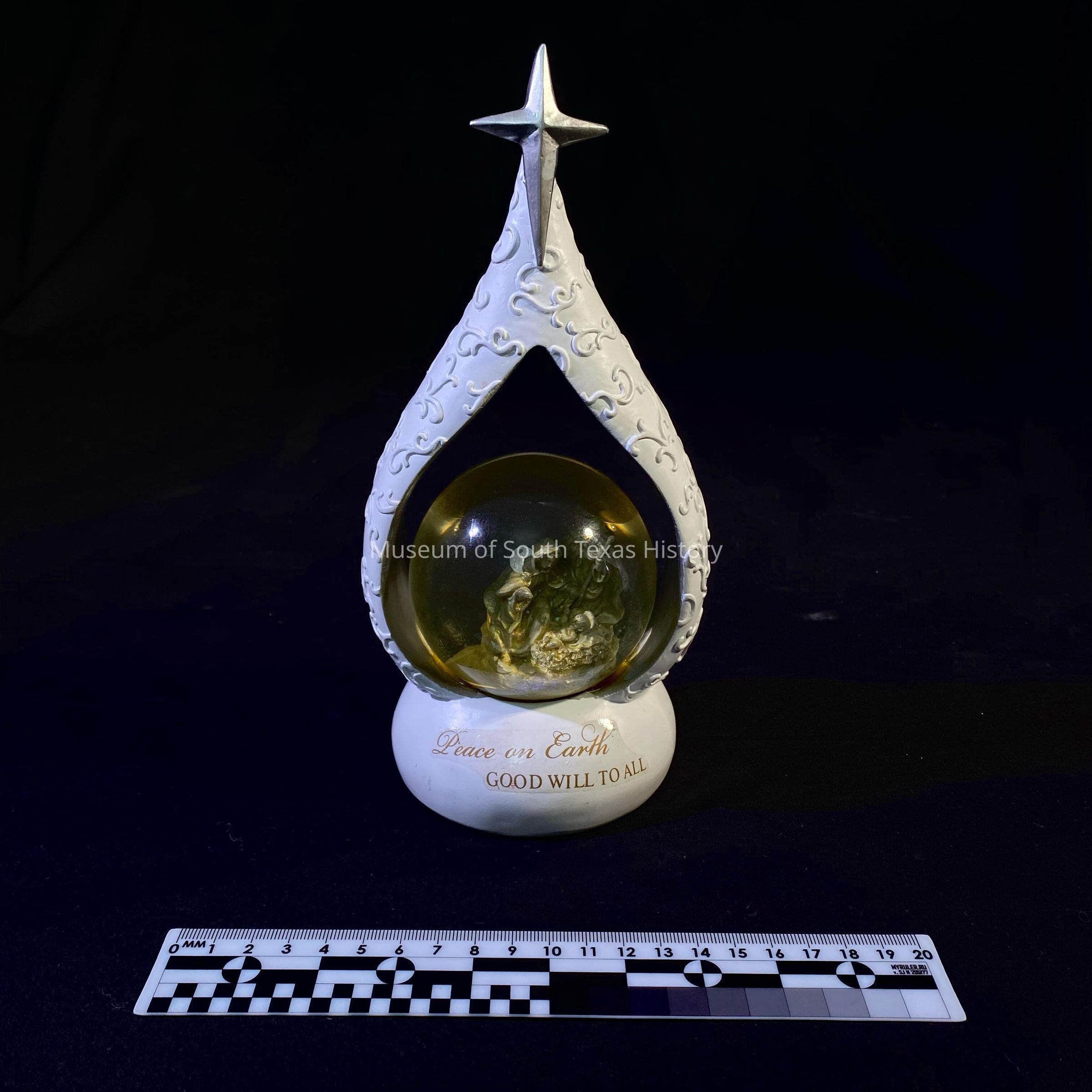 Ceramic figurine with snow globe inside. Figurine a star at the top and the outside has swirl like pattern, on the stand it says "Peace on Earth Good Will To All." Inside the snow globe is Mary, Joseph, and baby Jesus and blue glitter.Context