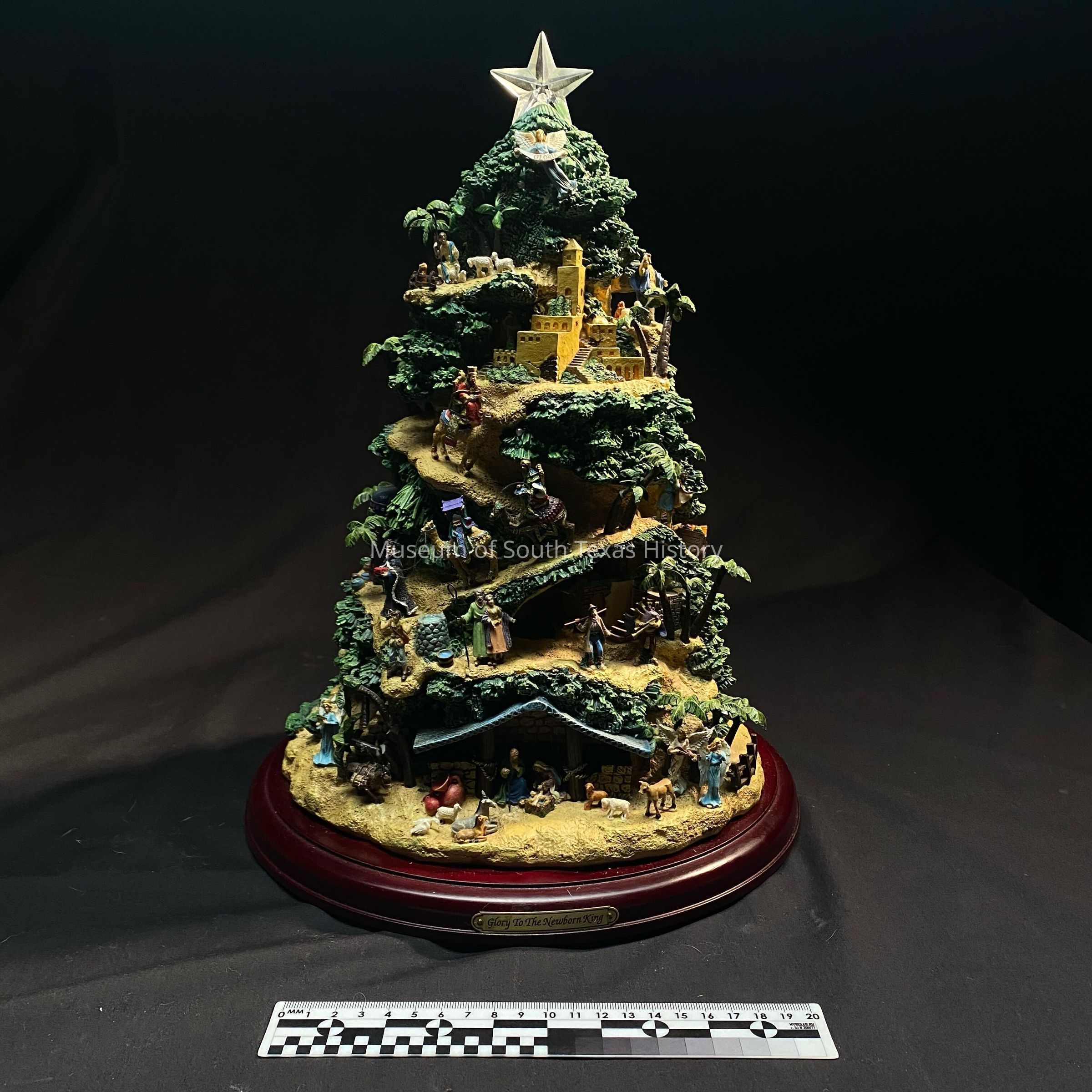 Statuette of a Christmas tree depicting the nativity scene in a subtropical climate with details of clay homes and palm trees. Statue is very delicate with few parts detached from statue. Pieces as small as hands and limbs from any parts sticking out as it was mounted. Statuette is mounted on a wooden display and may have also played music at one point from underneath.Context
