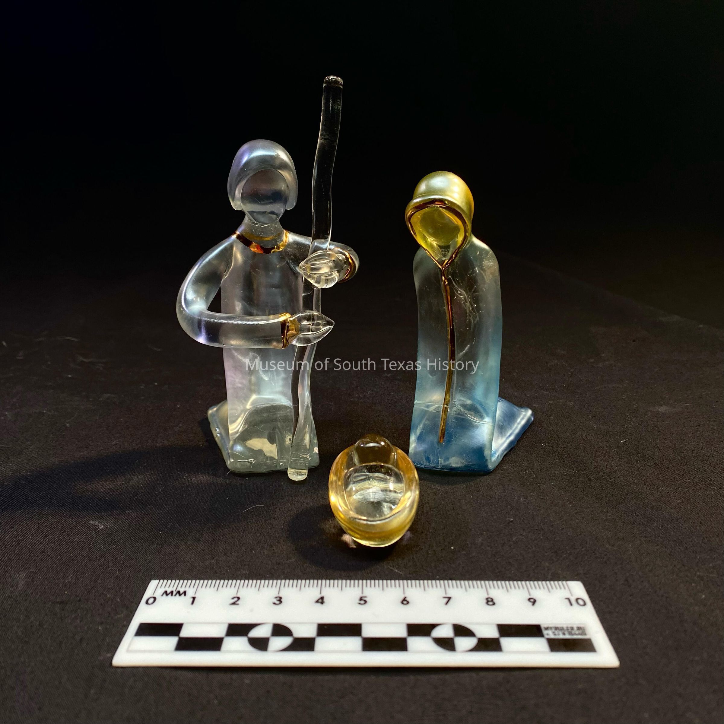 Frosted glass nativity set of Mary, Joseph, baby Jesus. Joseph is clear frosted with a staff and has gold trimmings on sleeves and neck. Mary is transparent, yellow and blue frosted glass with gold trimmings running down the middle and on the edge of the hood. Baby Jesus is clear transparent with hints yellow.Context