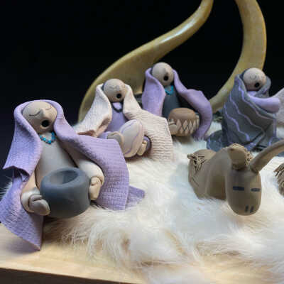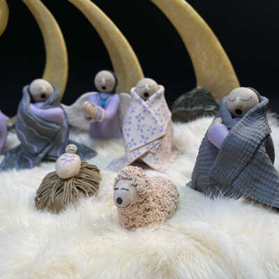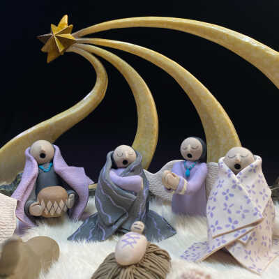 Polymer clay nativity scene with fur hide, plastic rocks attached to a shooting star, with clay figurine (10) seven singing figures with blankets (some patterned and plain). Three figurines are holding items (drum, a pot, and an egg). One has angel wings, a baby Jesus, sheep and donkey. The fur is partially coming off, one figurine is missing their eyes, Jesus crib is cracking off.Context