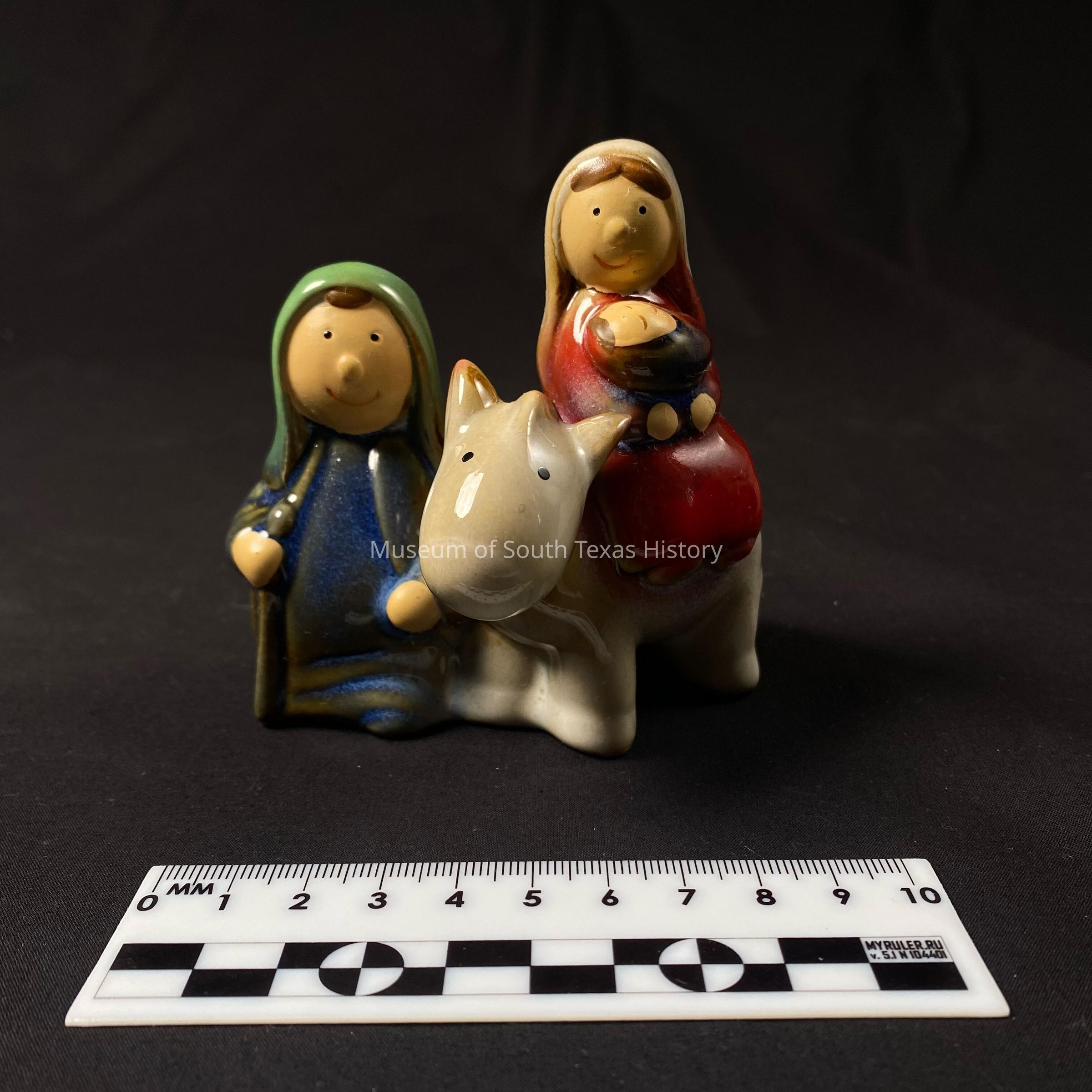 A glazed ceramic figurine, has Joseph, Mary, and baby Jesus, and a donkey. Faces has matte glaze and donkey, and clothing have a glossy glaze.Context