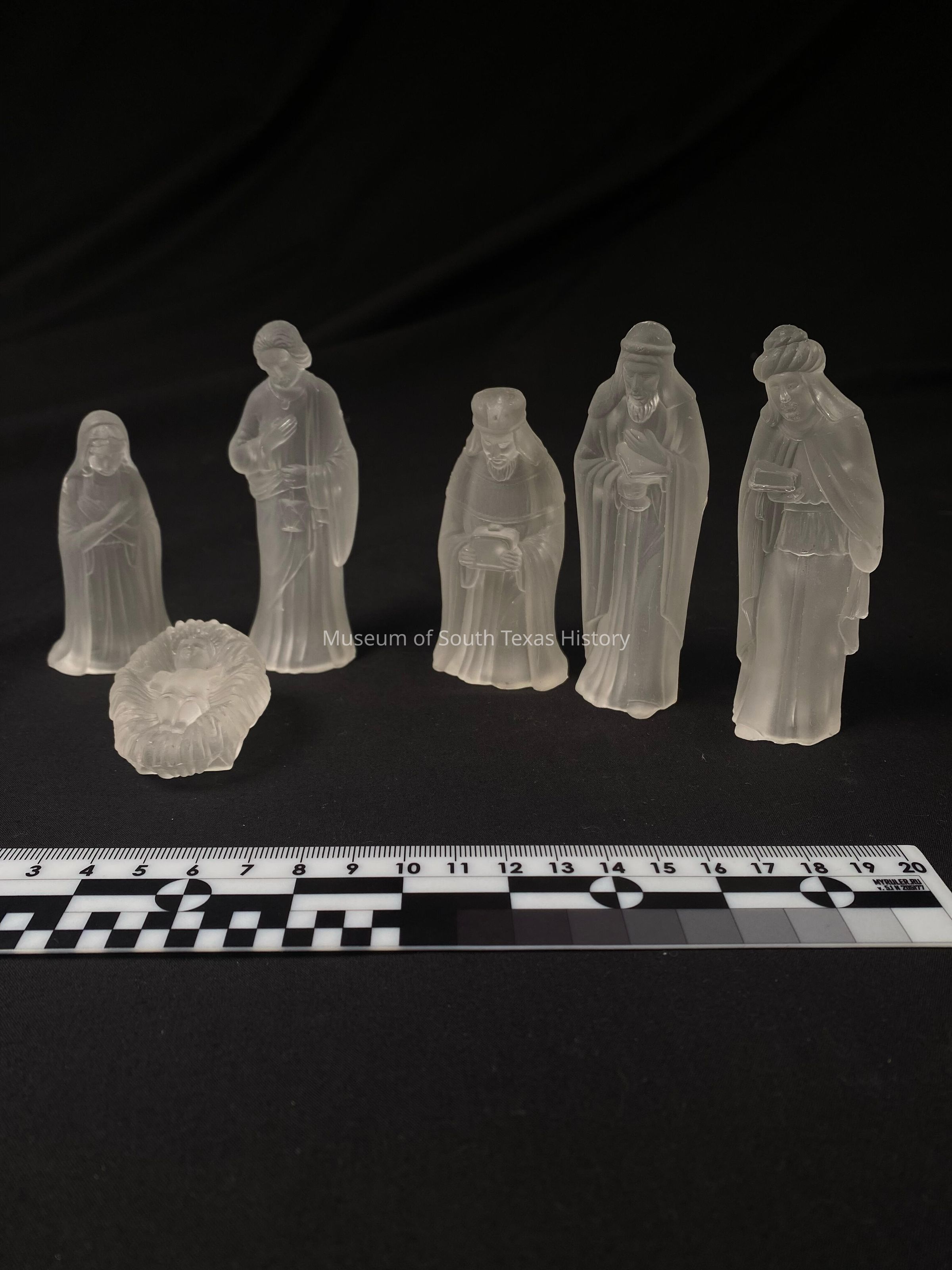 Six frosted hollow plastic figures of Mary, baby Jesus, Joseph, and three wise men.Context