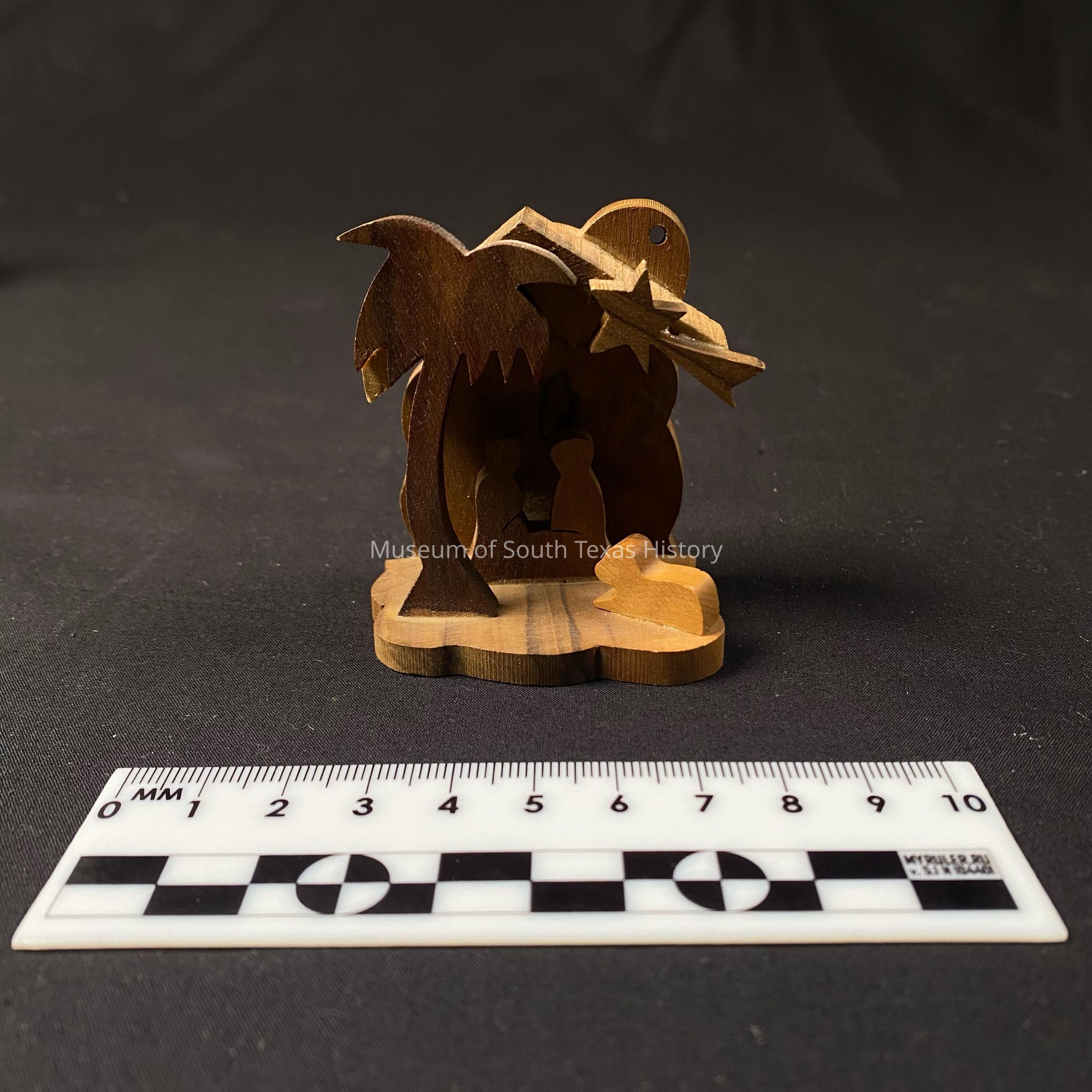 A small wood nativity display of Joseph, Mary, baby Jesus, a lamb, a palm tree, and a shooting star.Context