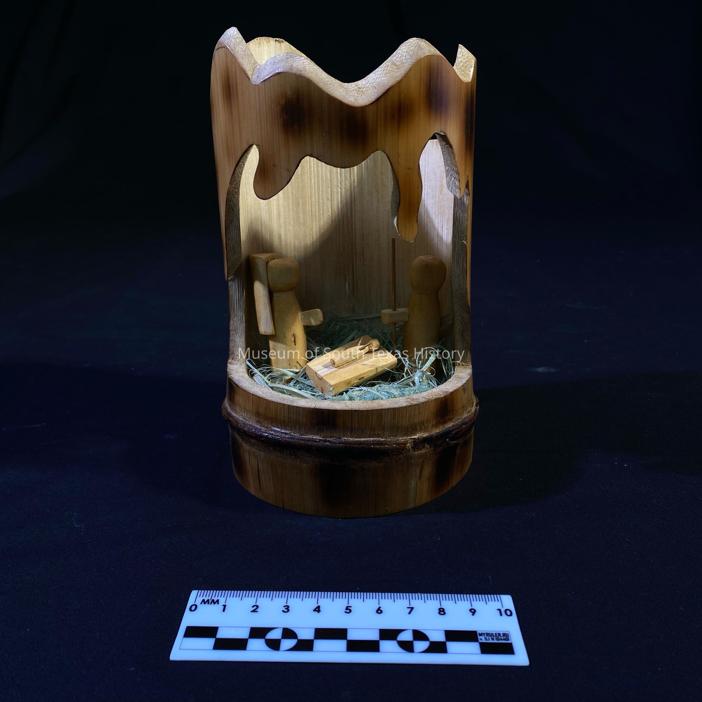 A wooden hollow cylinder figurine of Mary, Joseph and baby Jesus with plastic hay on the bottom.Context