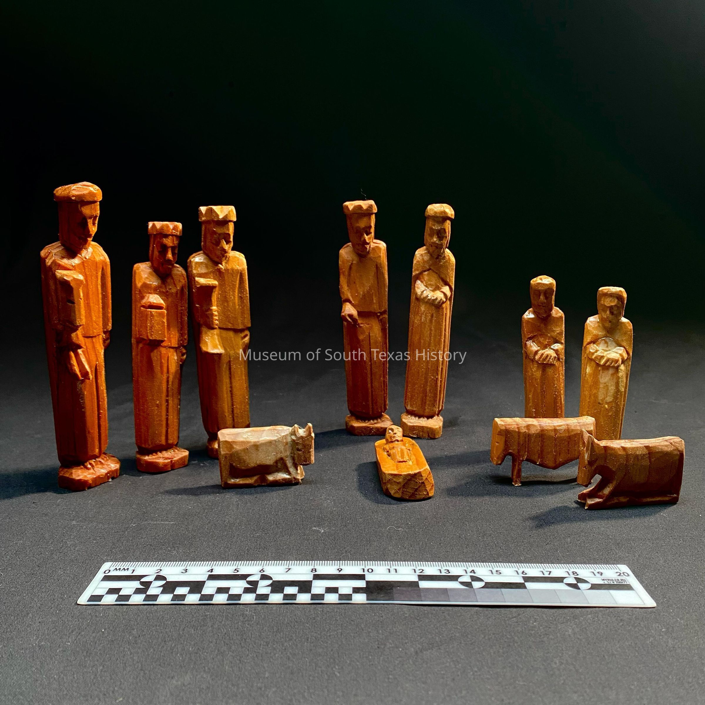 Eleven wooden nativity figurines, has several men, baby Jesus, and three animals.Context