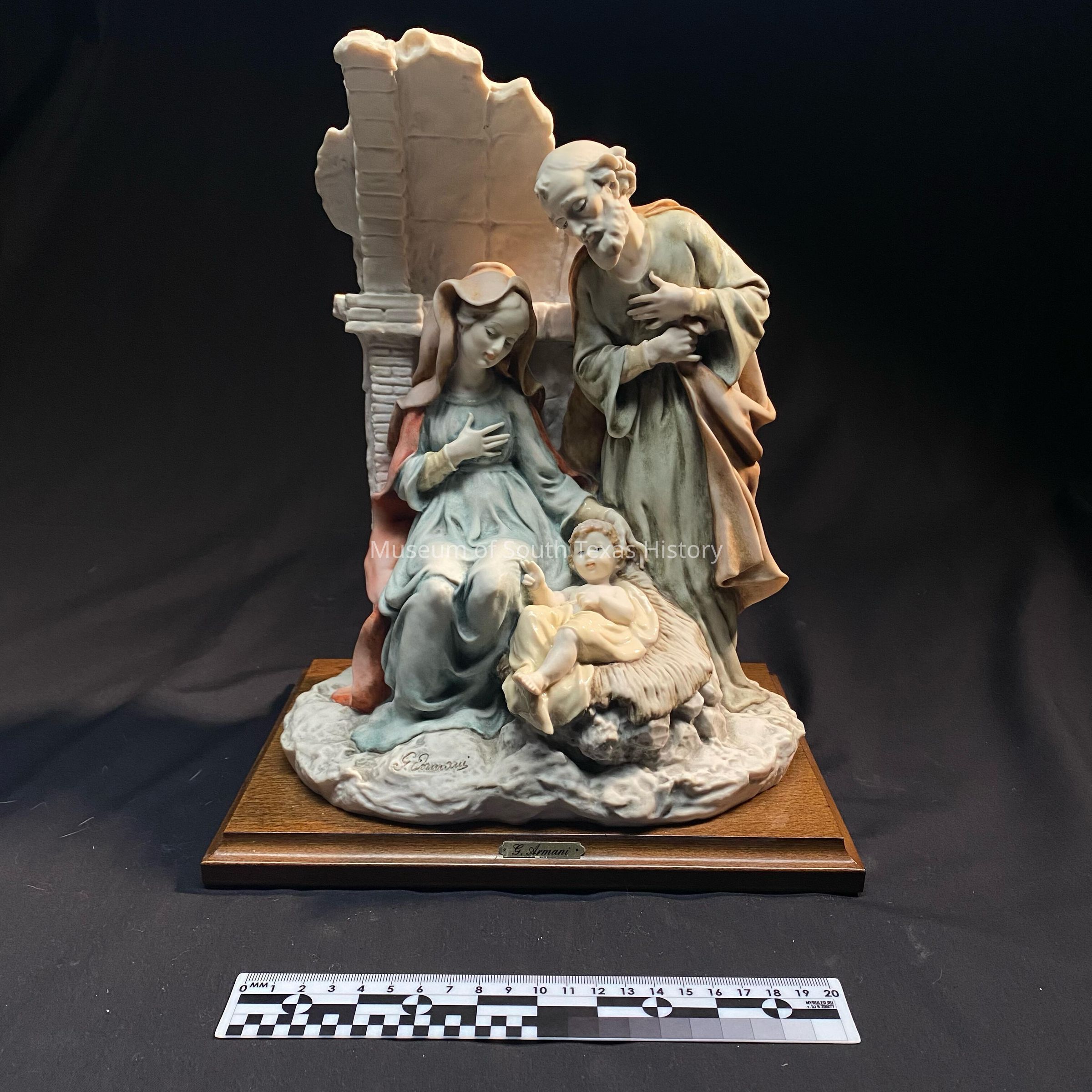 Porcelain nativity statuette depicting the Holy Family with a piece of wall to their backs. The statuette is attached to a wooden base with a gold metal plaque in center that reads "G. Armani". Carved inscriptions on the back of the porcelain statuette reads "C(opyright) 1983 Florence" and a blue, letter N, stamped besides it. Possibly the icon or logo of the manufacturer.Context