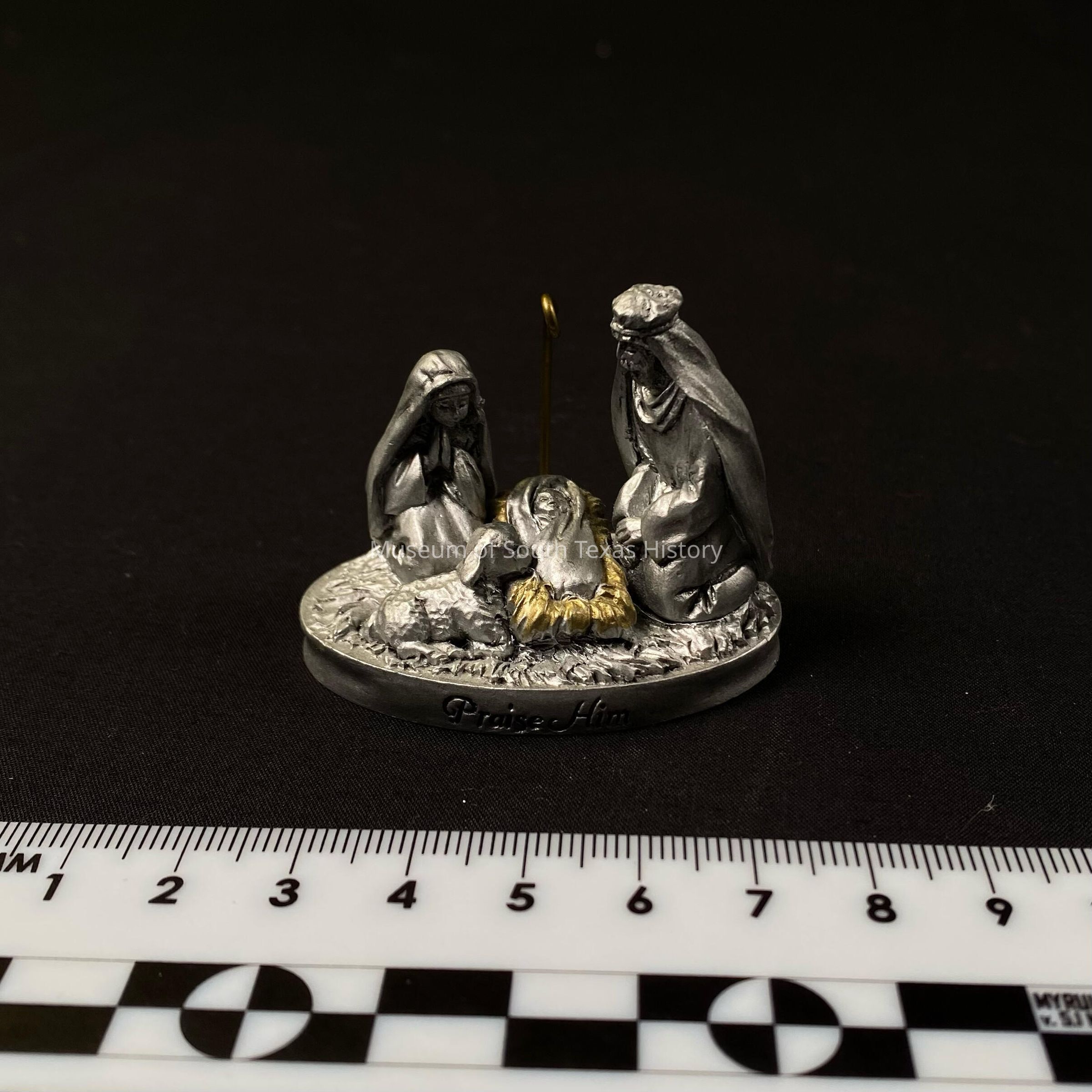 One piece nativity set, made of plastic with words "Praise Him" inscribed on front of base. Figure is painted silver with the exception of Jesus' cradle and Joseph's cane, which are painted gold.Context