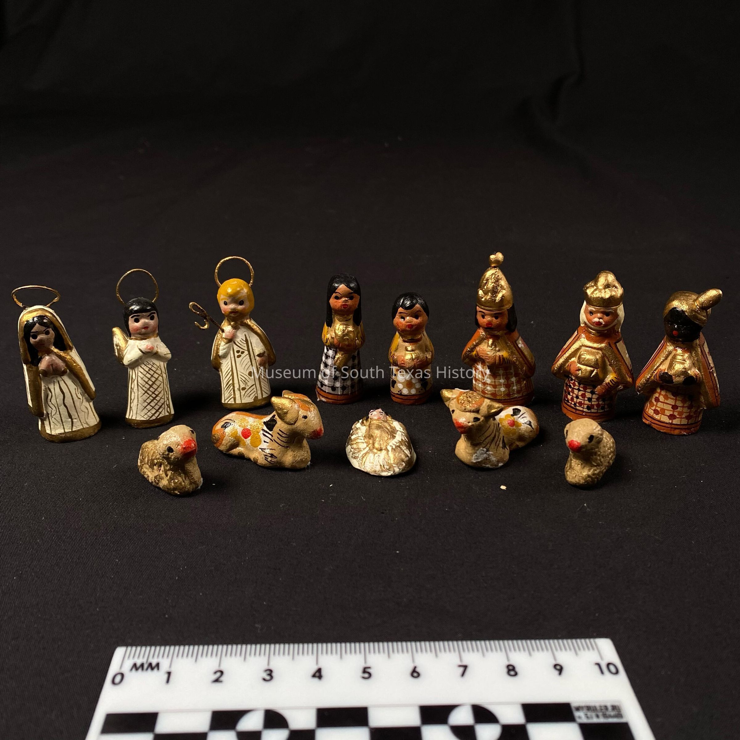 Thirteen painted ceramic figurines, with assorted colors such as gold, red, brown, and off white. Halos and cane seem to be made of wire.Context