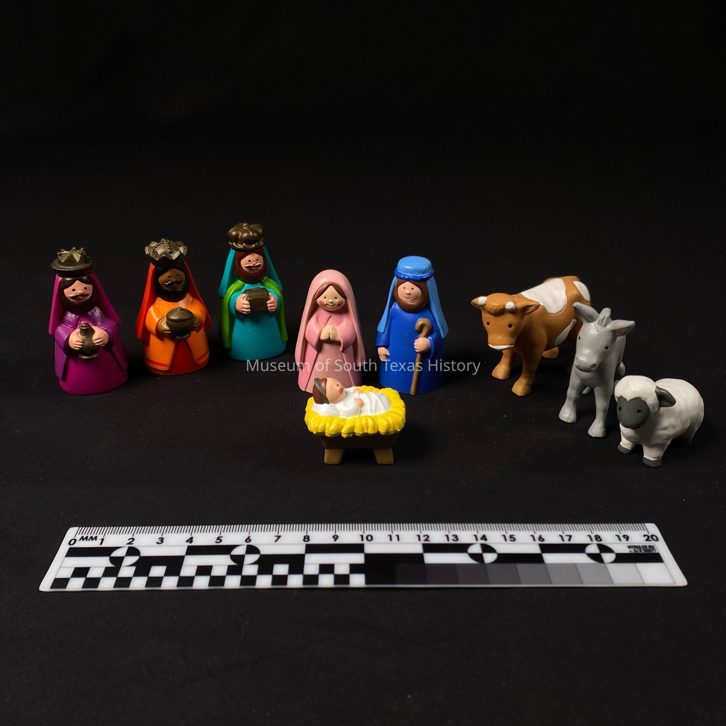Nativities scene of the birth of Jesus Christ as nine rubber plastic figures. The eight figures are Mary, Joseph, Jesus, the Three Wise Men, and three cattle animals. They appear to be modeled as toys for children.Context
