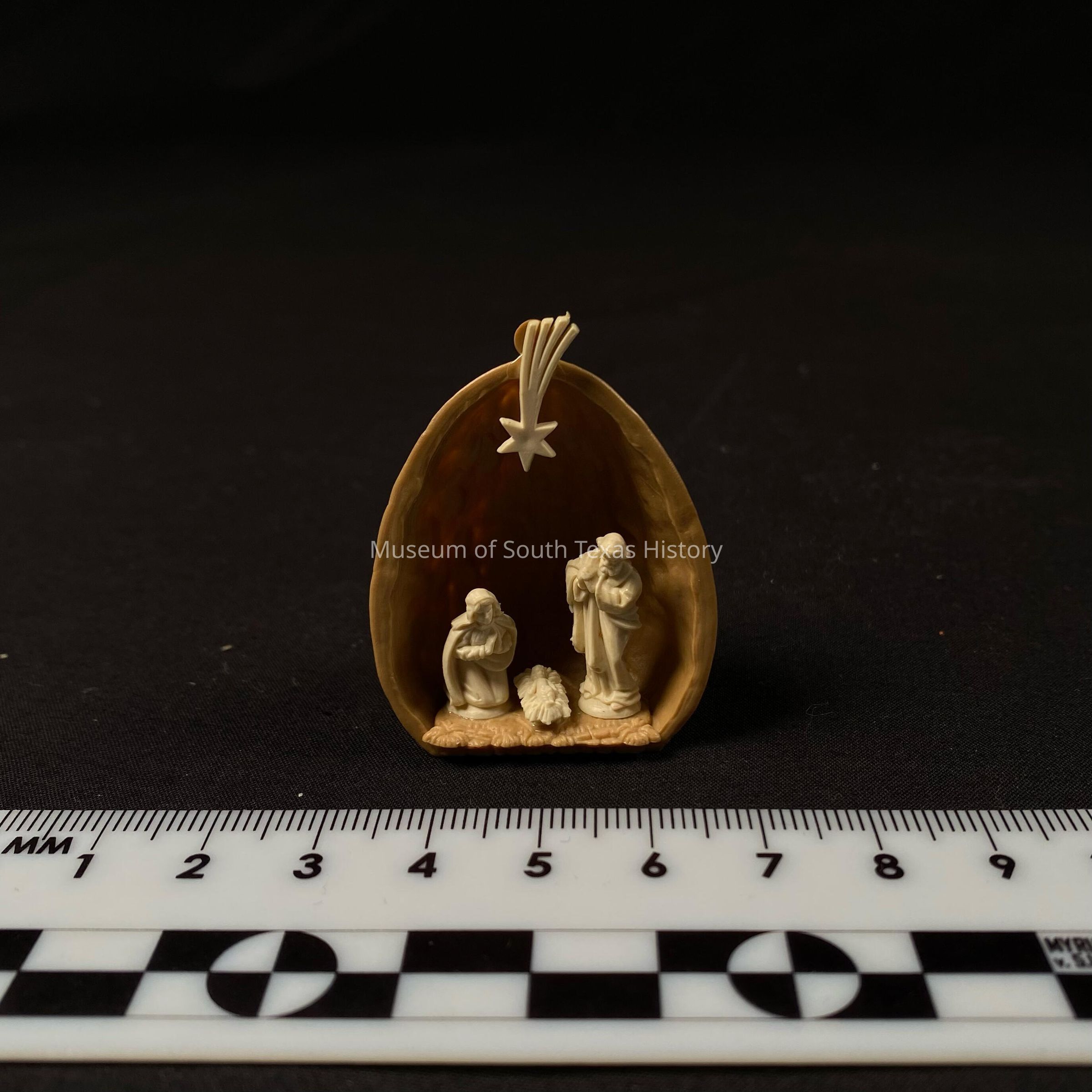 An ornament of a nativity scene depicting Jesus' birth in a hollowed out walnut shell. The figures included inside this are made of plastic. There being 4 details such as Joseph, Mary, baby Jesus, and a star overhead.Context