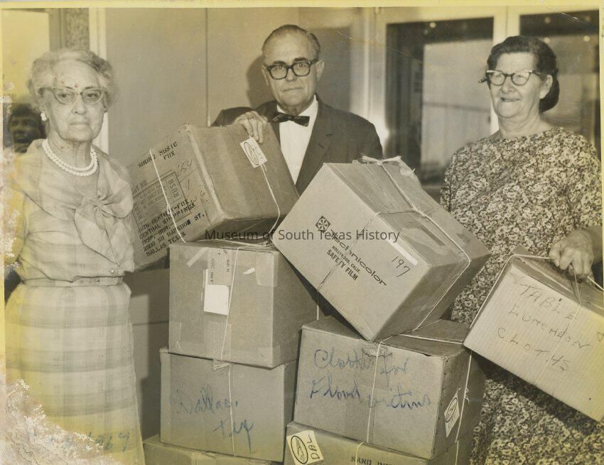 Black and white photo of a man and two women standing with a number of boxes. Written on the back is for disaster victims.