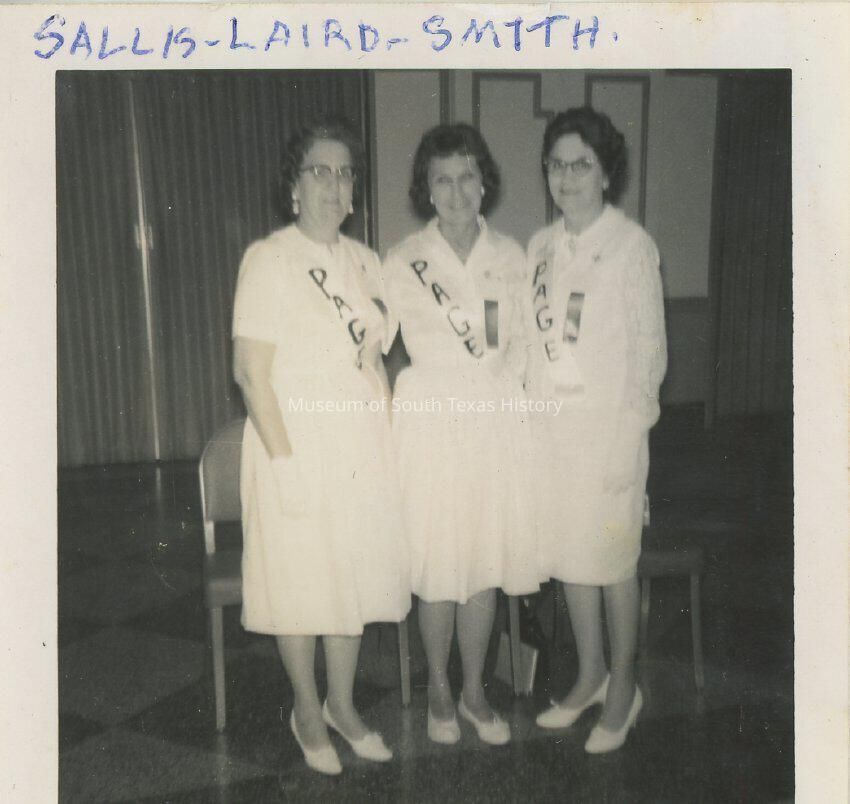 Three women dressed in white sashes that read "page". On front is written Sallis-Laird-Smith. Pages 9-14-64. On the back it says …therine Salis, …dred Laird-Corpus Christi, Emma Smith-Irving. Photo is torn on the back and not all the writing is legible.