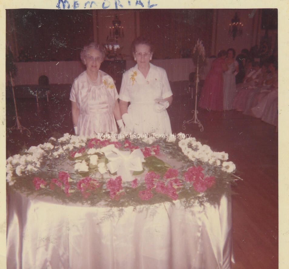 Color photo of two women standing next to a table covered with flowers and ribbon. On the front is written memorial, Aug. 11, 1964. Back is torn and not all the writing can be made out, it looks like it once said Aug. 11, 1964 Goins Tex, Memorial Service Natl Con.