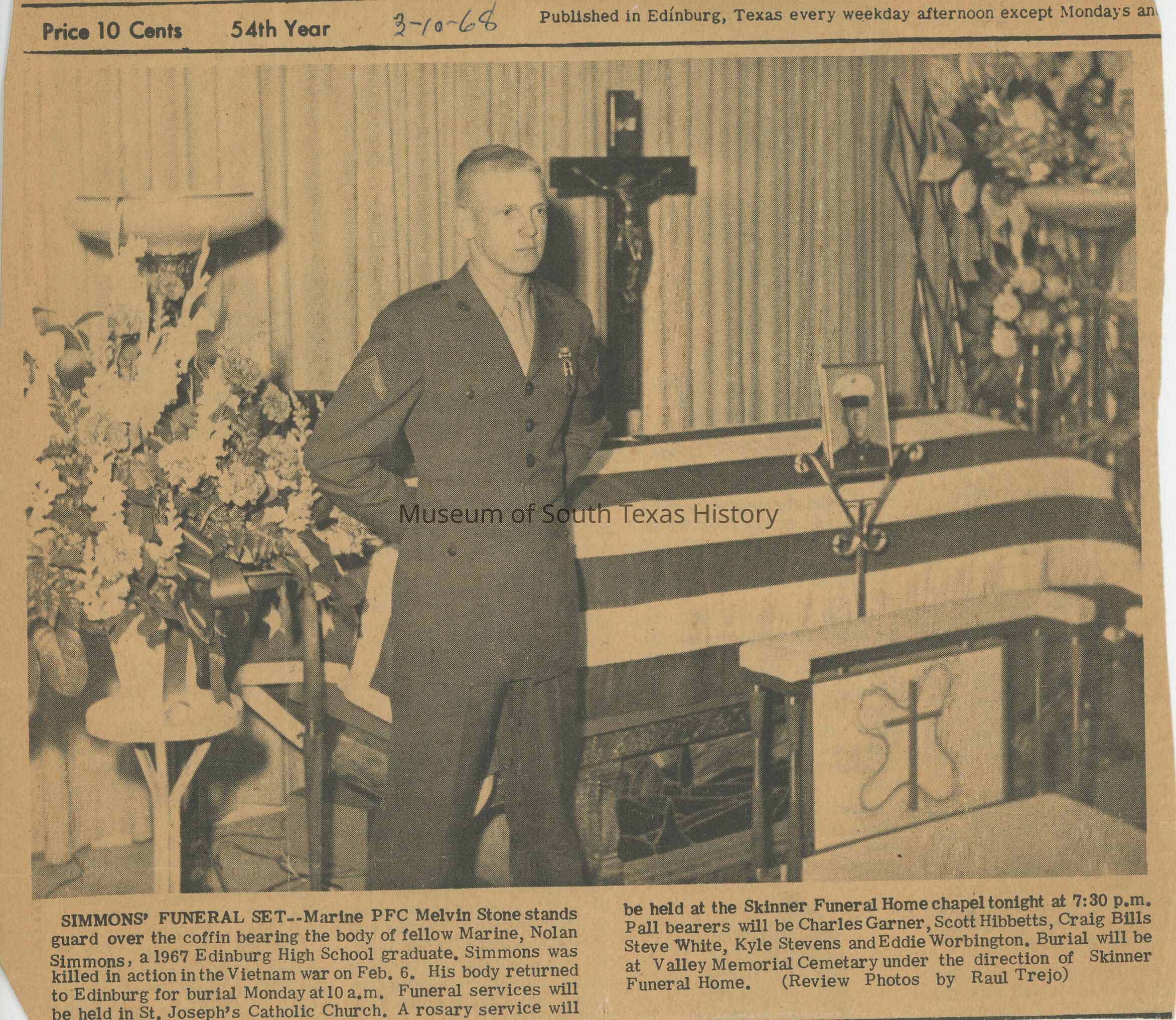 Newspaper clipping about the funeral for Nolan SimmonsCollection