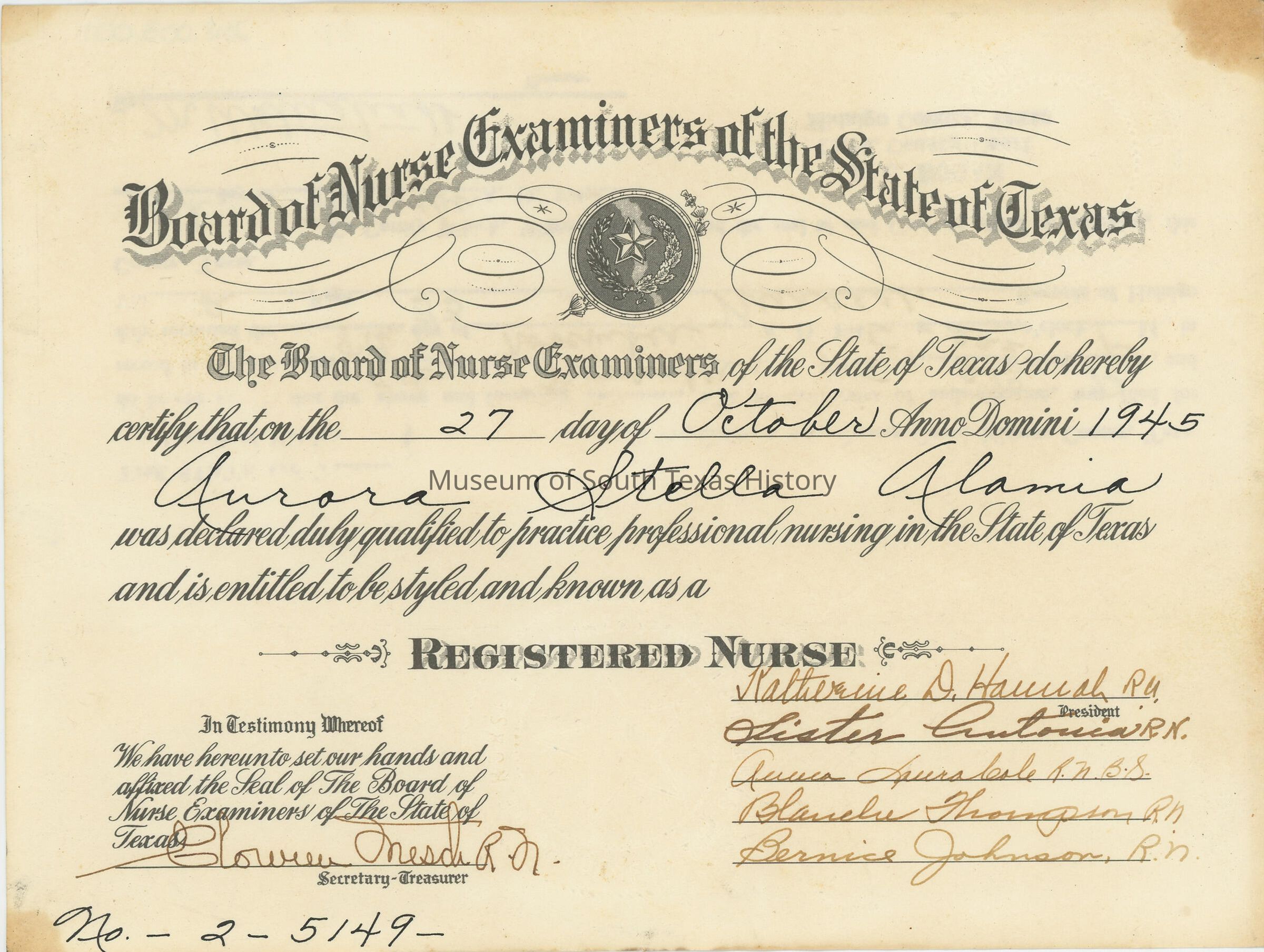 Garza graduated from Edinburg High School in 1942 and went immediately to nursing school at the McAllen Municipal Hospital, graduating in 1945. According to family members, she was one of only five women in her graduating class from the hospital. After graduation she continued working at the McAllen hospital, and she was subsequently a nurse at Grandview Hospital in Edinburg, a school nurse in the La Joya and Edinburg districts for more than 20 years, and a visiting nurse.Collection