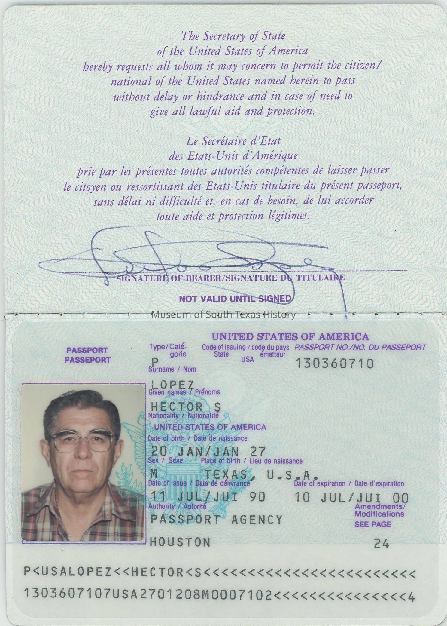 Identification page of a passport issue to Hector Lopez. Active from the years 1990-2000. Includes French translated terms.