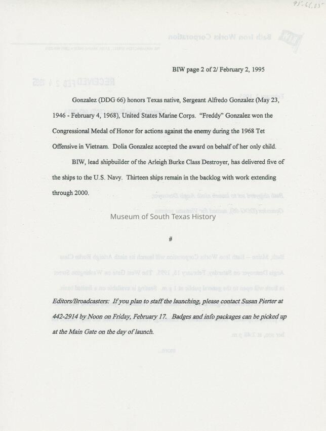 Press release regarding the launch of the Destroyer Gonzalez
