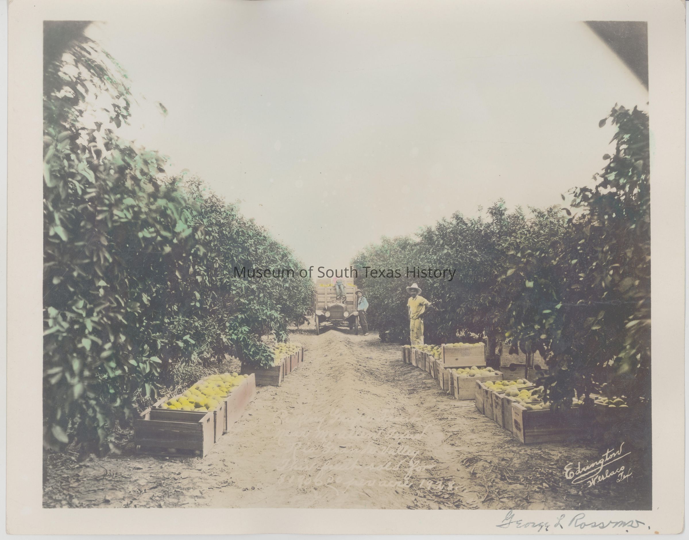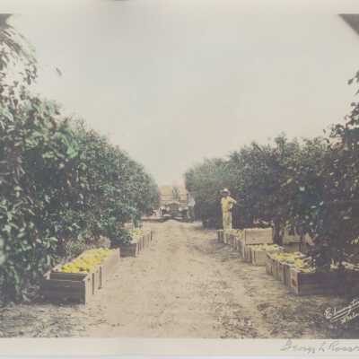 Pulling grapefruit near McAllen, Texas, Rio Grande Valley. This fruit sold for $1,900 per acre 1928. Shows boxes of grapefruit ready to load onto truck.Collection