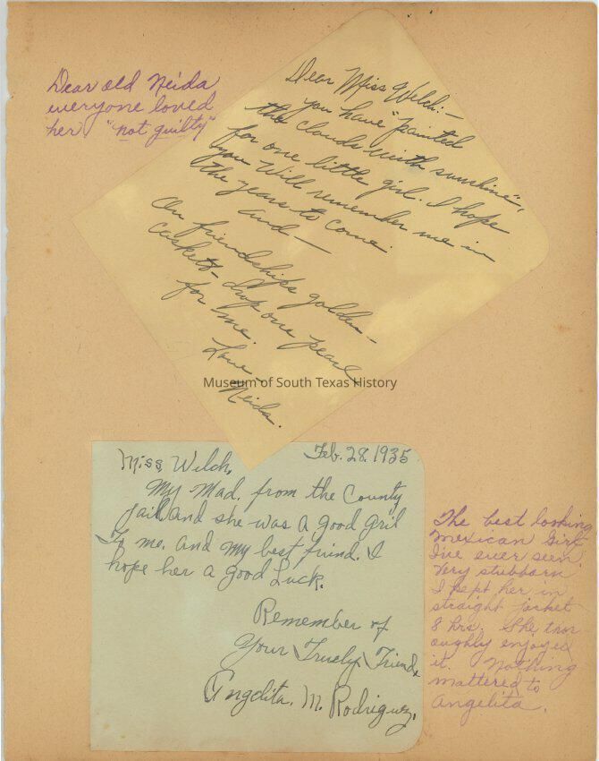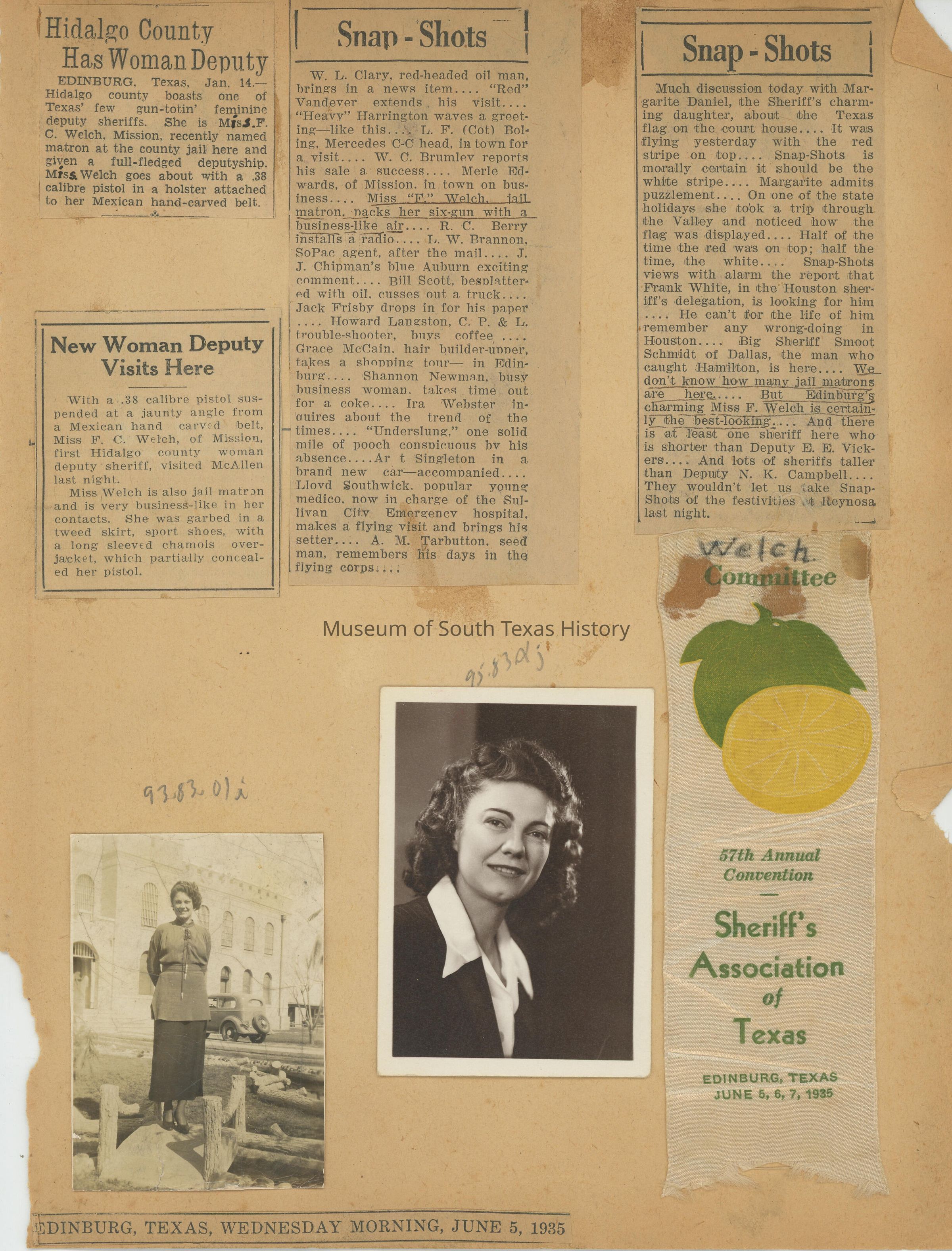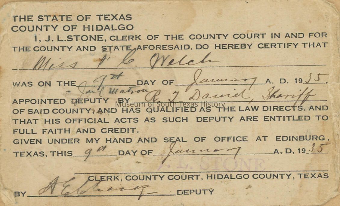 Fern Catherine Welch became the first female sheriff’s deputy in Hidalgo County in January of 1935 when she was named matron of the Hidalgo County jail. She kept a scrapbook of her time as matron, and it is an eye-opening window into the past.