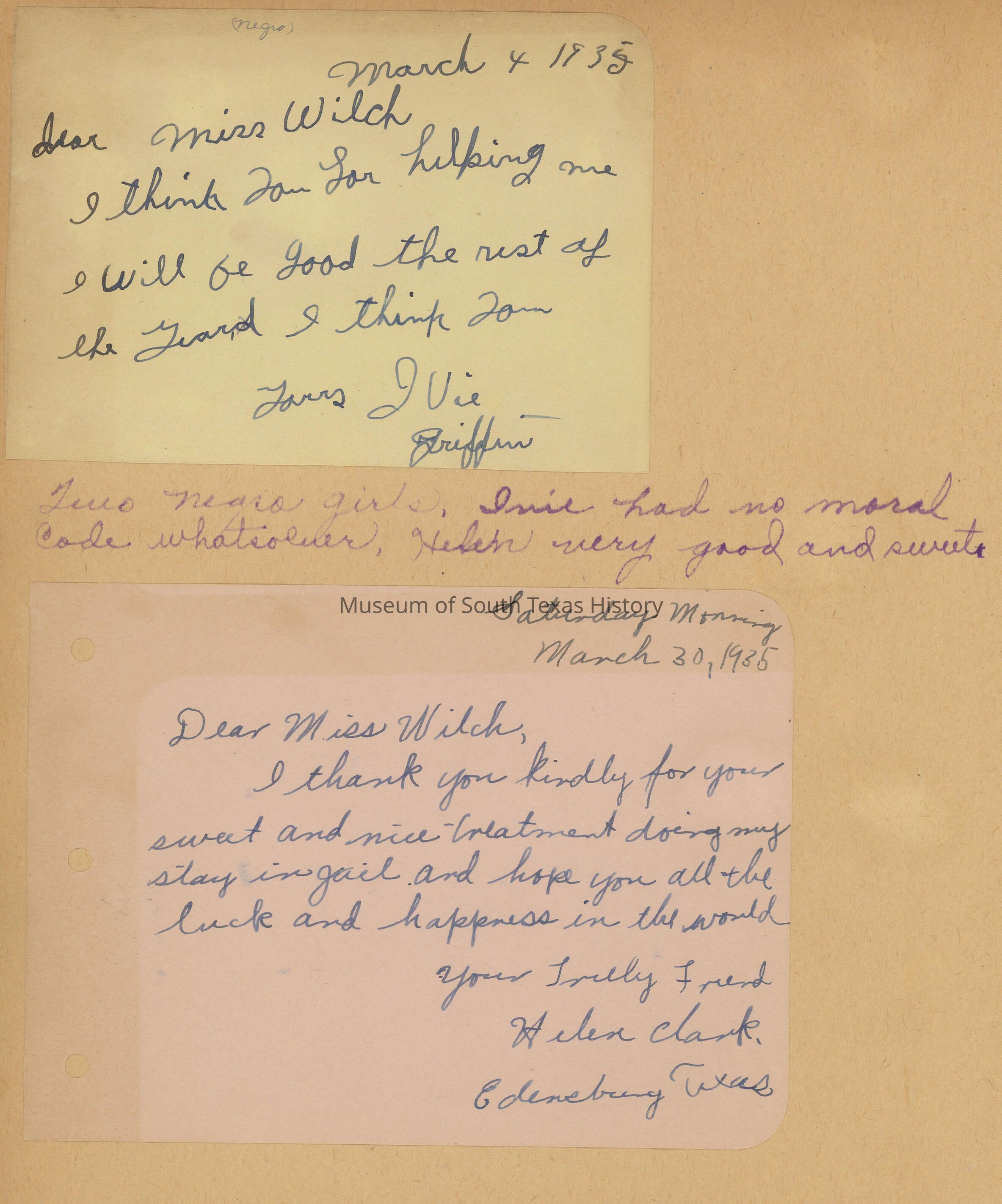 Besides documenting Welch’s career, the scrapbook also reveals something of the lives of the women who were prisoners. Some of the notes have notations that Ms. Welch made about the individual prisoners. There is a heart-breaking statement from a teenage girl about the abuse she suffered at the hands of her father and brothers. She bore a child at age 14. Another item seems to be a goodbye letter from a possibly suicidal woman who was accused of murder; a note later in the scrapbook indicates she was found not guilty.Collection