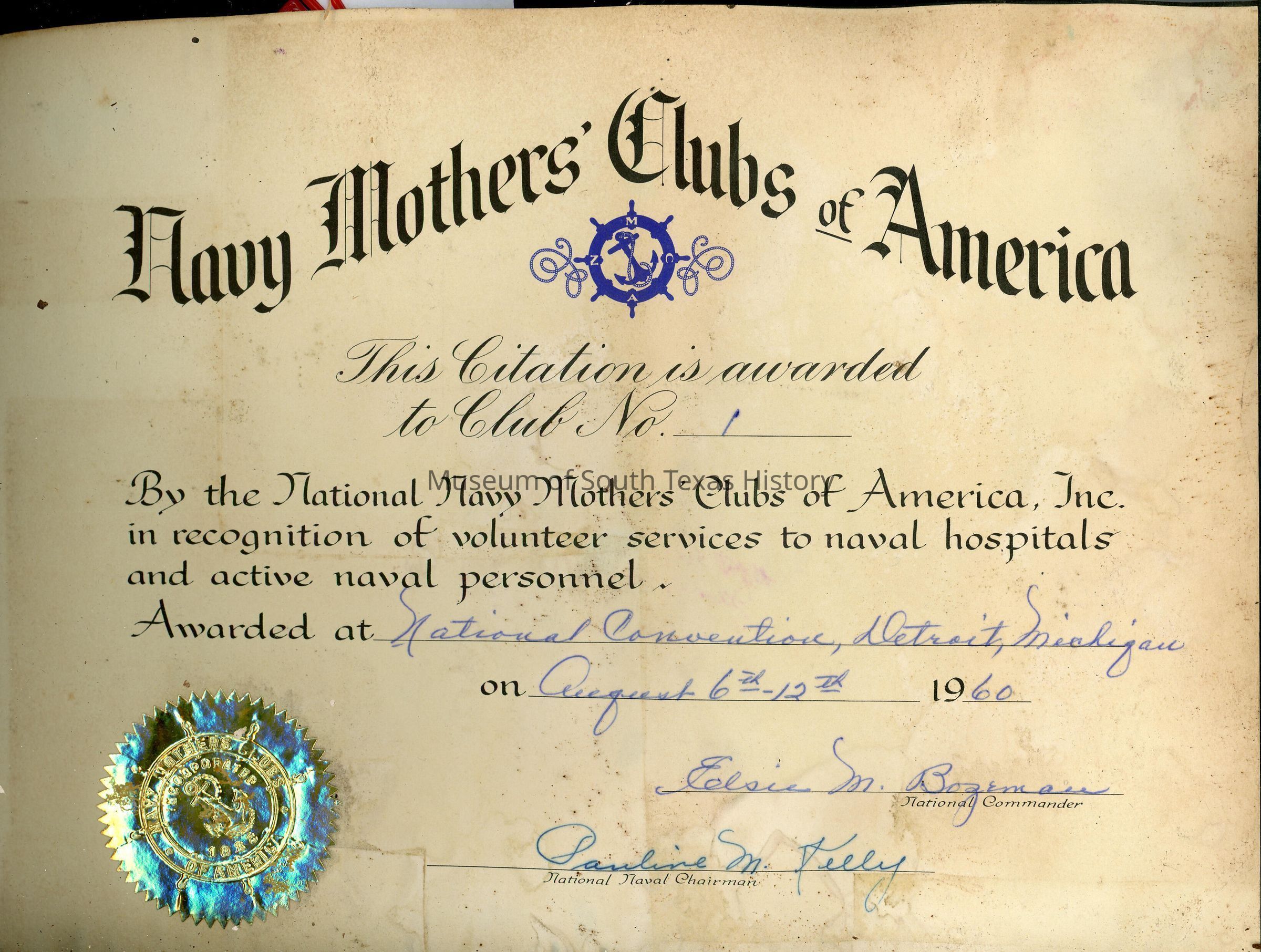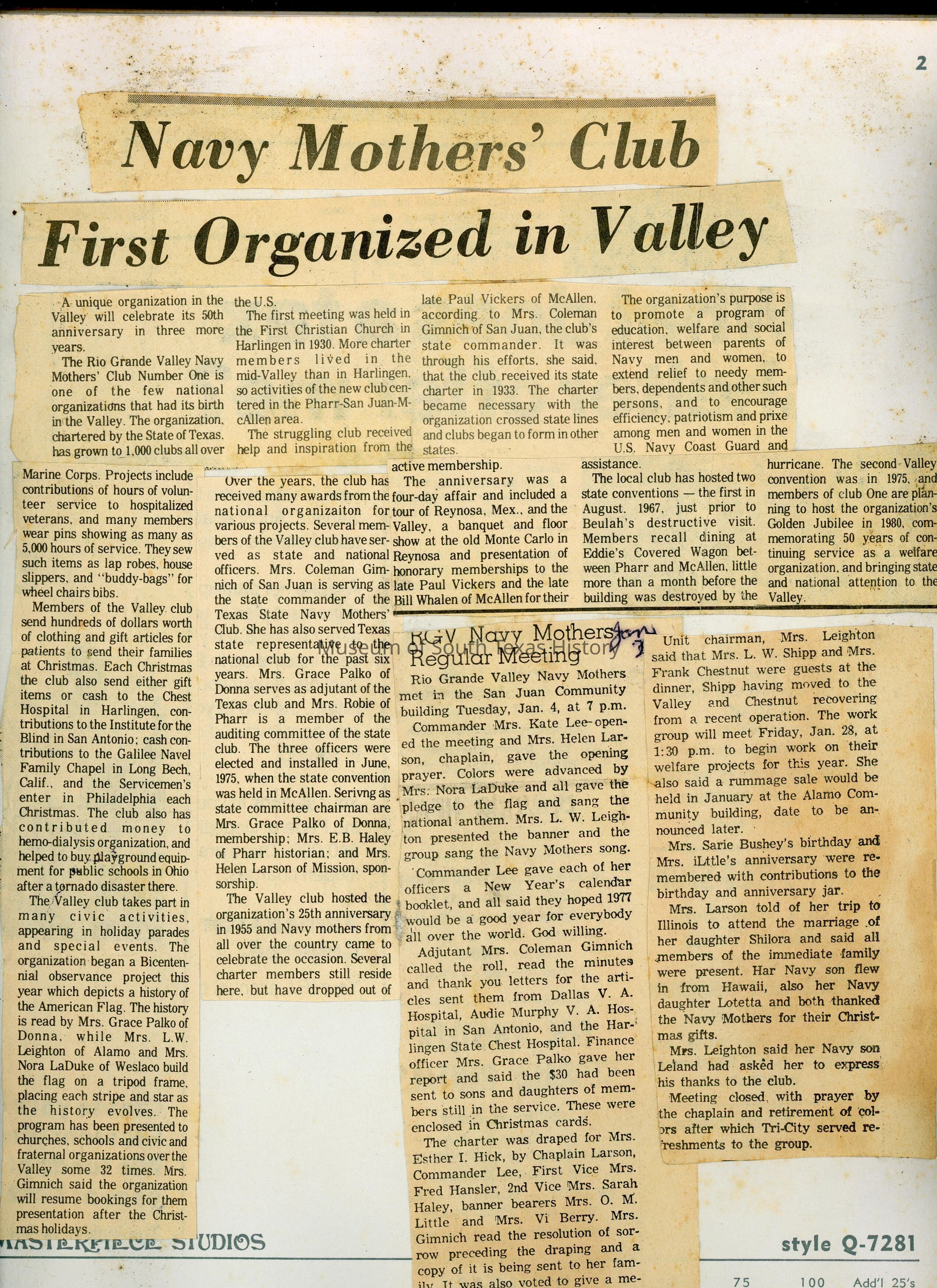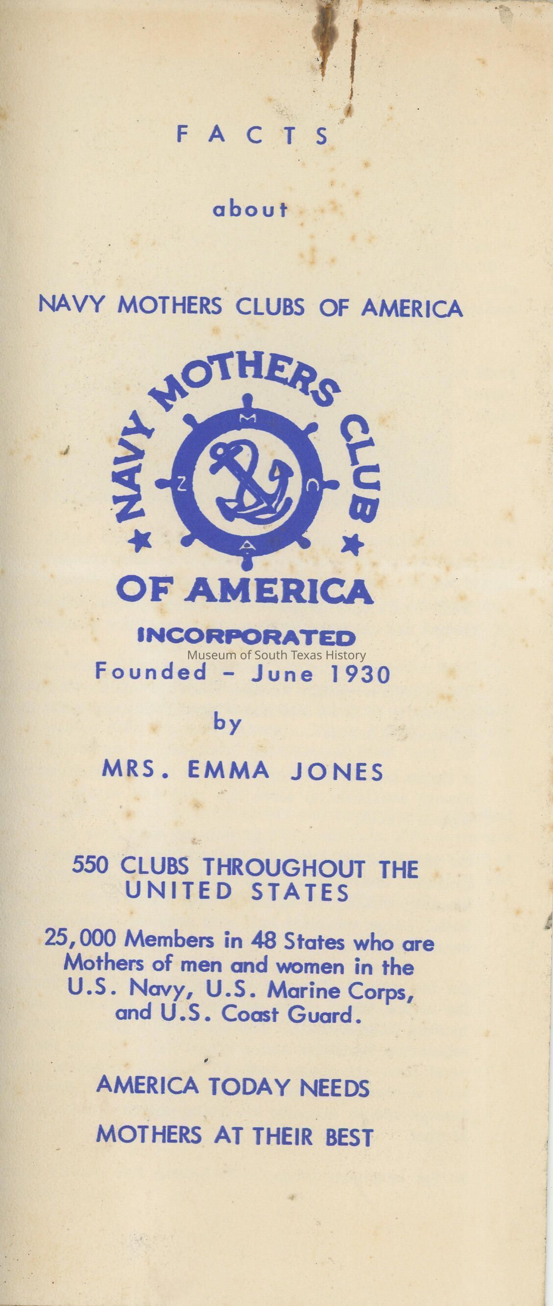 Emma Jones began the first Navy Mothers Club in McAllen, Texas, in 1930. Chapter No. 1 began with 29 members. Just before and after World War II, numerous other clubs formed around the U.S. Traveling to Washington, D.C., Jones helped secure recognition of the Navy Mother's Clubs of America from the U.S. Navy itself. The clubs promoted "social, charitable, and educational work among the Navy men and their families," according to a 1941 article in The Monitor newspaper of McAllen. The organization also supported Navy women and Coast Guard members.Collection
