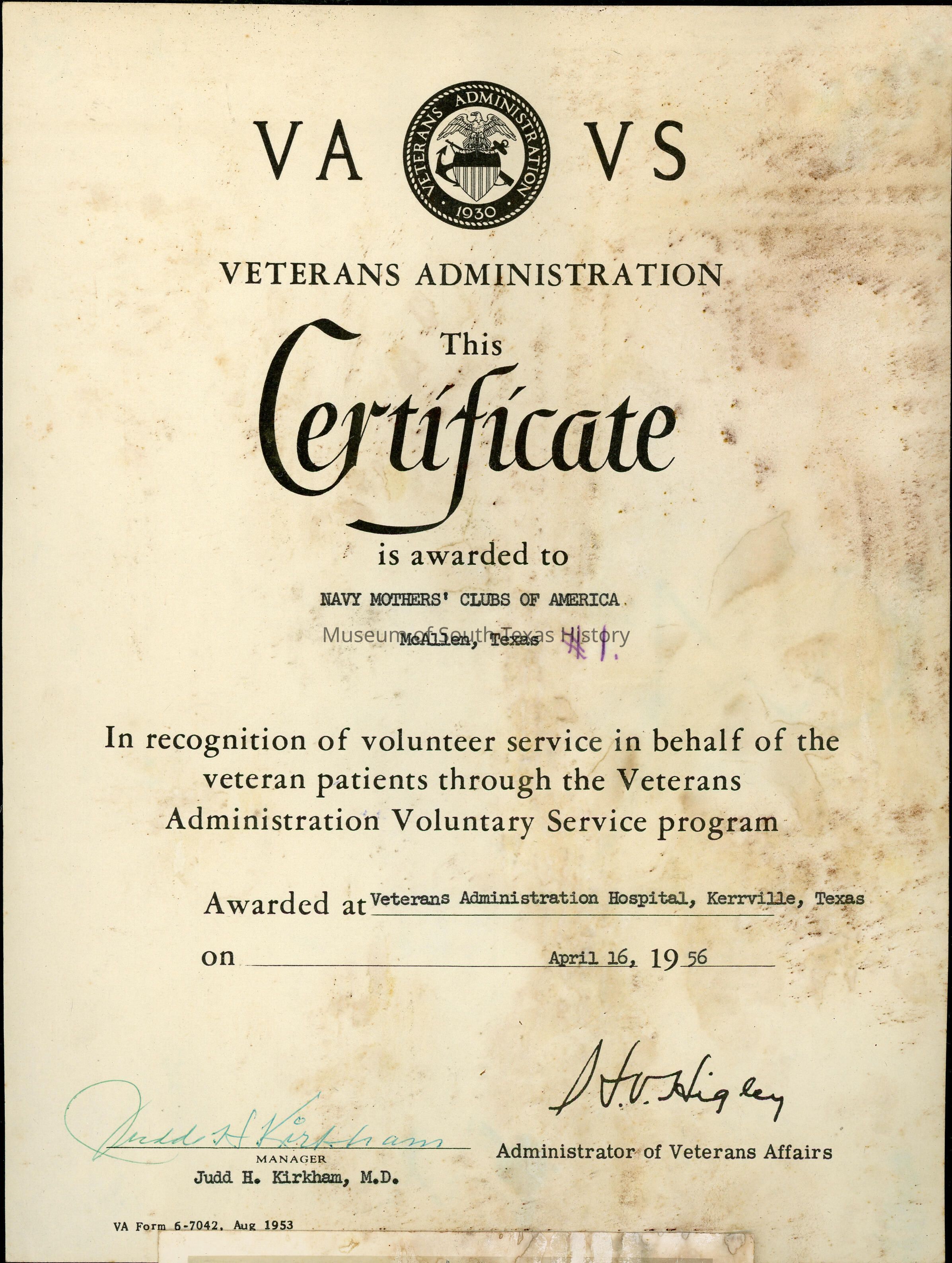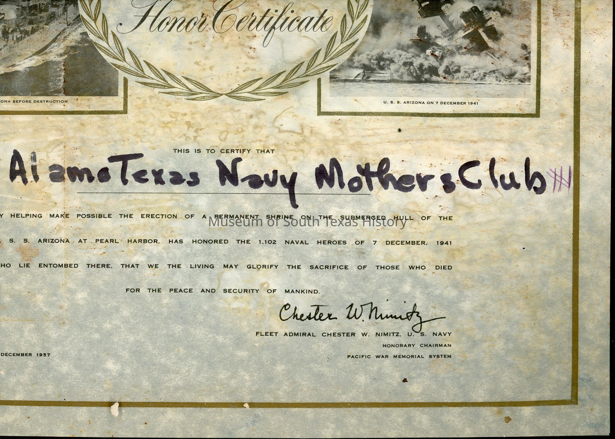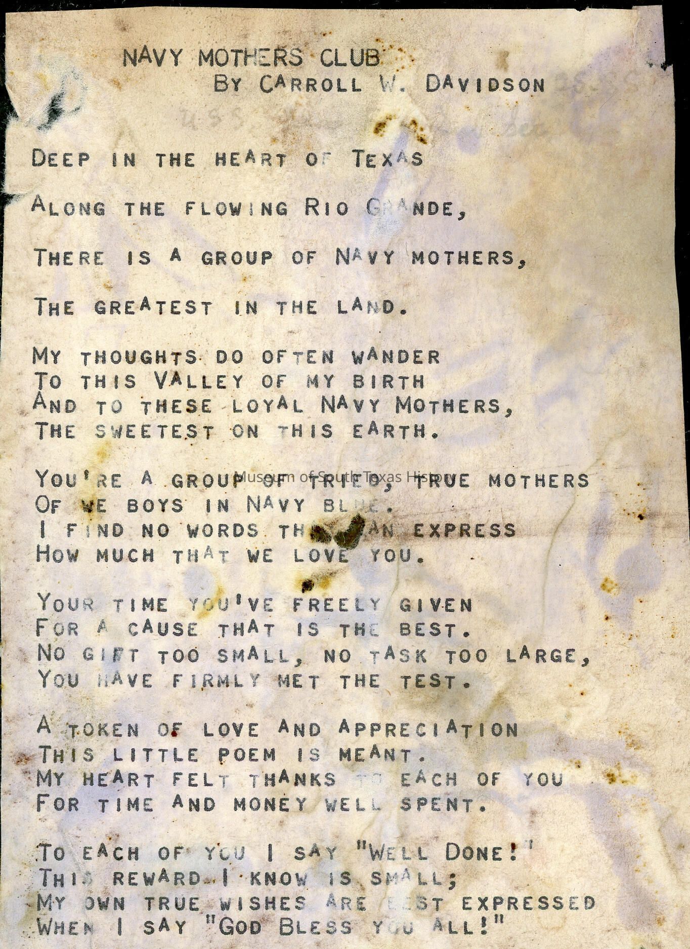 Emma Jones began the first Navy Mothers Club in McAllen, Texas, in 1930. Chapter No. 1 began with 29 members. Just before and after World War II, numerous other clubs formed around the U.S. Traveling to Washington, D.C., Jones helped secure recognition of the Navy Mother's Clubs of America from the U.S. Navy itself. The clubs promoted "social, charitable, and educational work among the Navy men and their families," according to a 1941 article in The Monitor newspaper of McAllen. The organization also supported Navy women and Coast Guard members.Collection