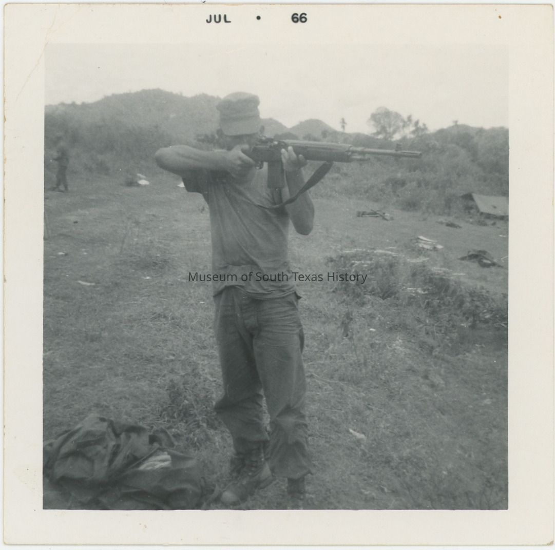 Soldier posing with gun. Based on comparison with other images this may be Freddy Gonzalez. Part of a group of photos Freddy Gonzalez sent home from Vietnam.Collection