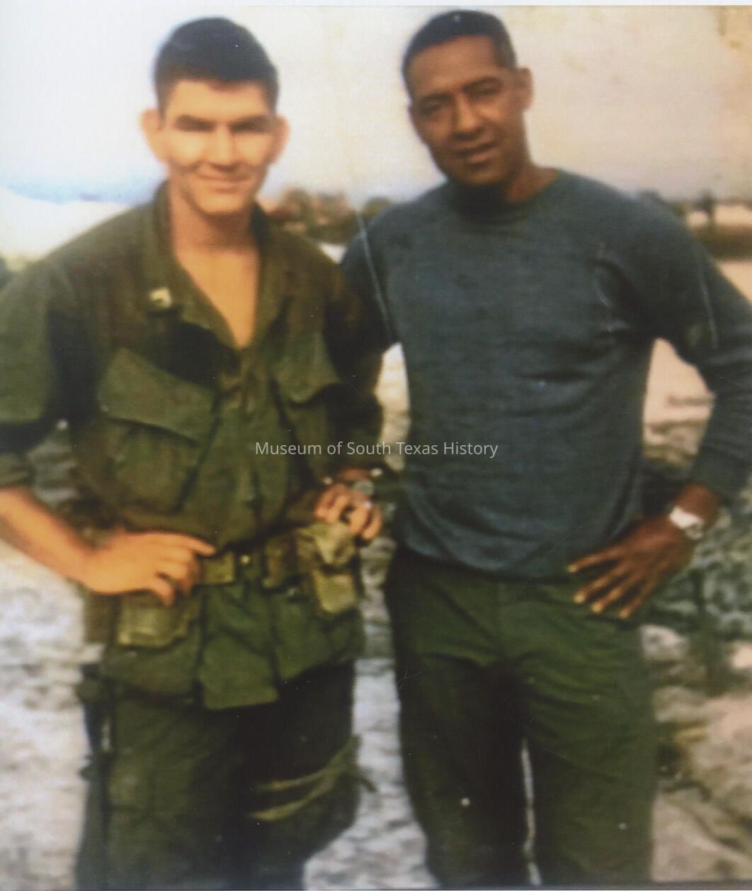 Sgt Freddy Gonzalez and gunnery sergeant John Canley in Vietnam, 1960s. In life there was a considerable height difference between the two, Canley being taller, but they appear to be the same height in this photo.Collection