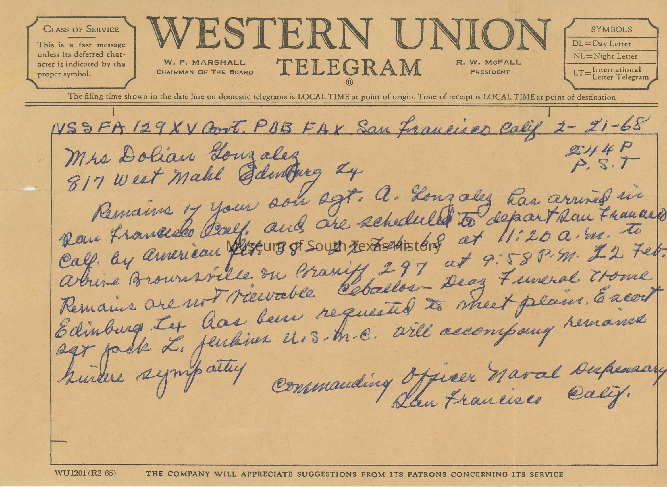 Western Union telegram informing Ms. Gonzalez of the arrival of her sons remains in Brownsville.