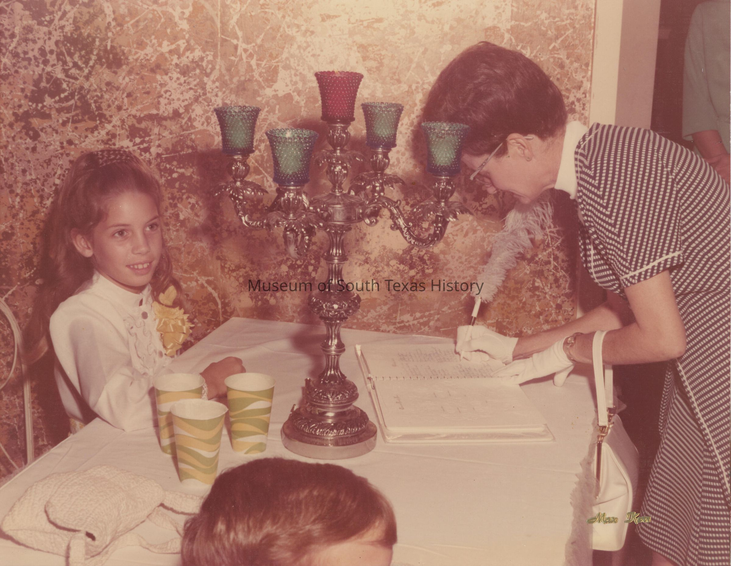Photo of an unidentified girl sitting at a table. An older woman is standing at the front of the table and appears to be signing a guest book.Collection