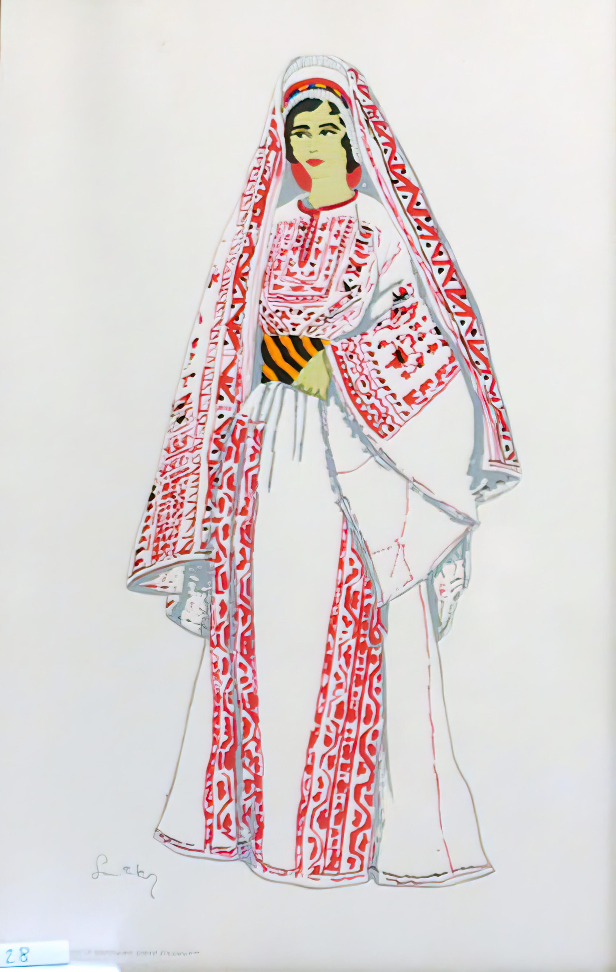 The typical Ramallah thobe of the early 20th century consisted of a white dress embroidered in red and black at the chest, skirt and sleeves, while the density of embroidery varied from one thobe to the other depending on the occasion. The thobe was belted with Syrian striped silk, while they wore a bonnet called Wuqaya that is also embroidered and lined with coins. With it an embroidered white scarf called a Khirqa was draped over the Wuqaya. Whether or not the title is true, that the thobe of Ramallah featured here is from "near Jerusalem", is questionable, as the style presented in the illustration could be worn by Ramallah women regardless of their proximity to Jerusalem.