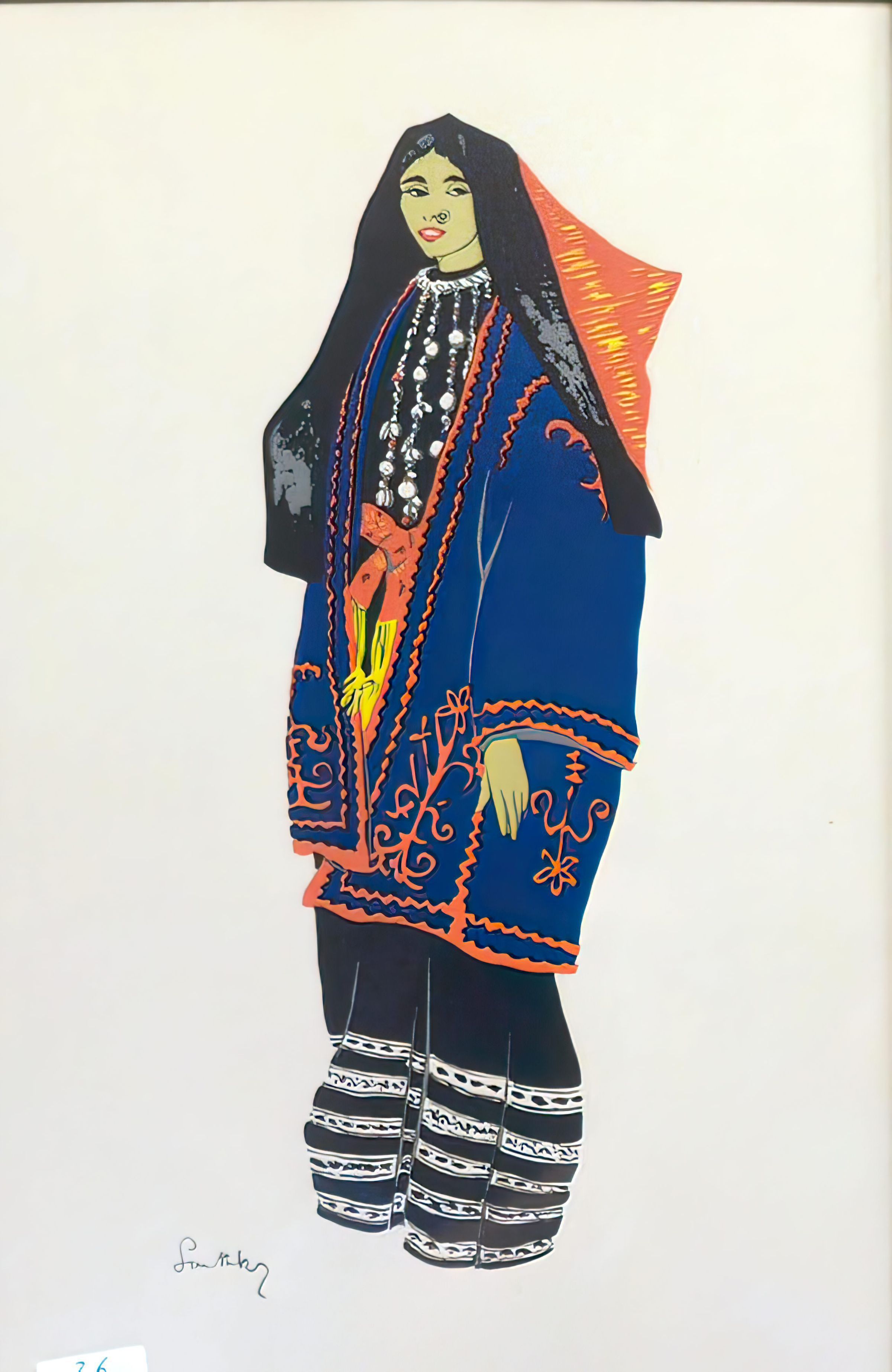 Object 2012.012(1-6) is a six-part series of illustrations produced by Susan Southby, titled "Costumes of the Holy Land" and signed in pencil. The illustrations use pochoir (French: “stencil”), and is distinguished from ordinary stenciling by a highly refined technique of making fine limited editions of stencil prints. The six costumes reproduced by Southby were included among a collection of thirty or more traditional dresses worn by Palestinian girls at a pageant in Beirut, organized by the Women's Auxiliary of the United Nations Relief Works Agency for Palestine Refugees intended to raise funds for charity. Southby produced the illustrations in the 1940s, published and distributed the drawings in 1953 by Dar Al-Maaret of Beirut, and the accompanying publication, also titled "Costumes of the Holy Land" was published in 1953 (1st edition) and 1957 (2nd edition).