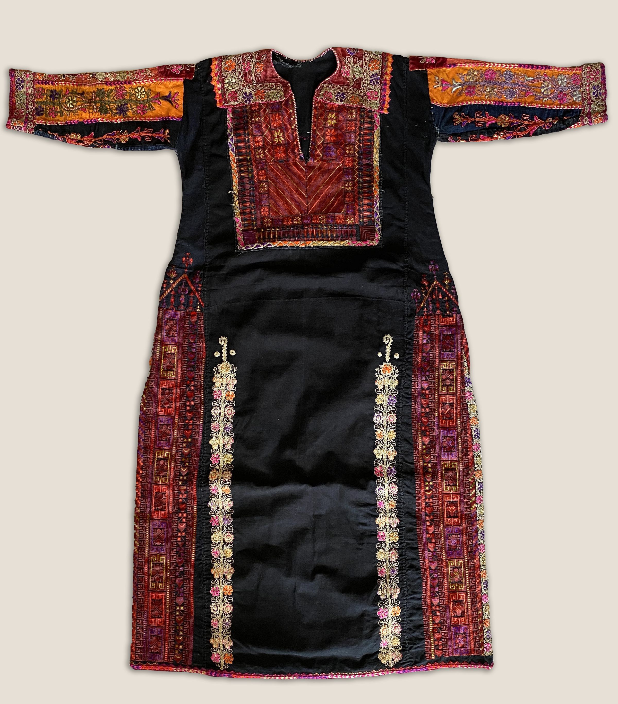 A typical dress of the Beit Dajan village in the Yaffa region in the 1930s. Cross-stitch used in the square chest panel using DMC pearl cotton thread, and couching stitch that uses lurex metallic thread cording in the shoulder panels, outline of the chest panel and on the sleeves. The tailoring of the dress is consistent to dresses that were produced between the 1930s and 1940s.
