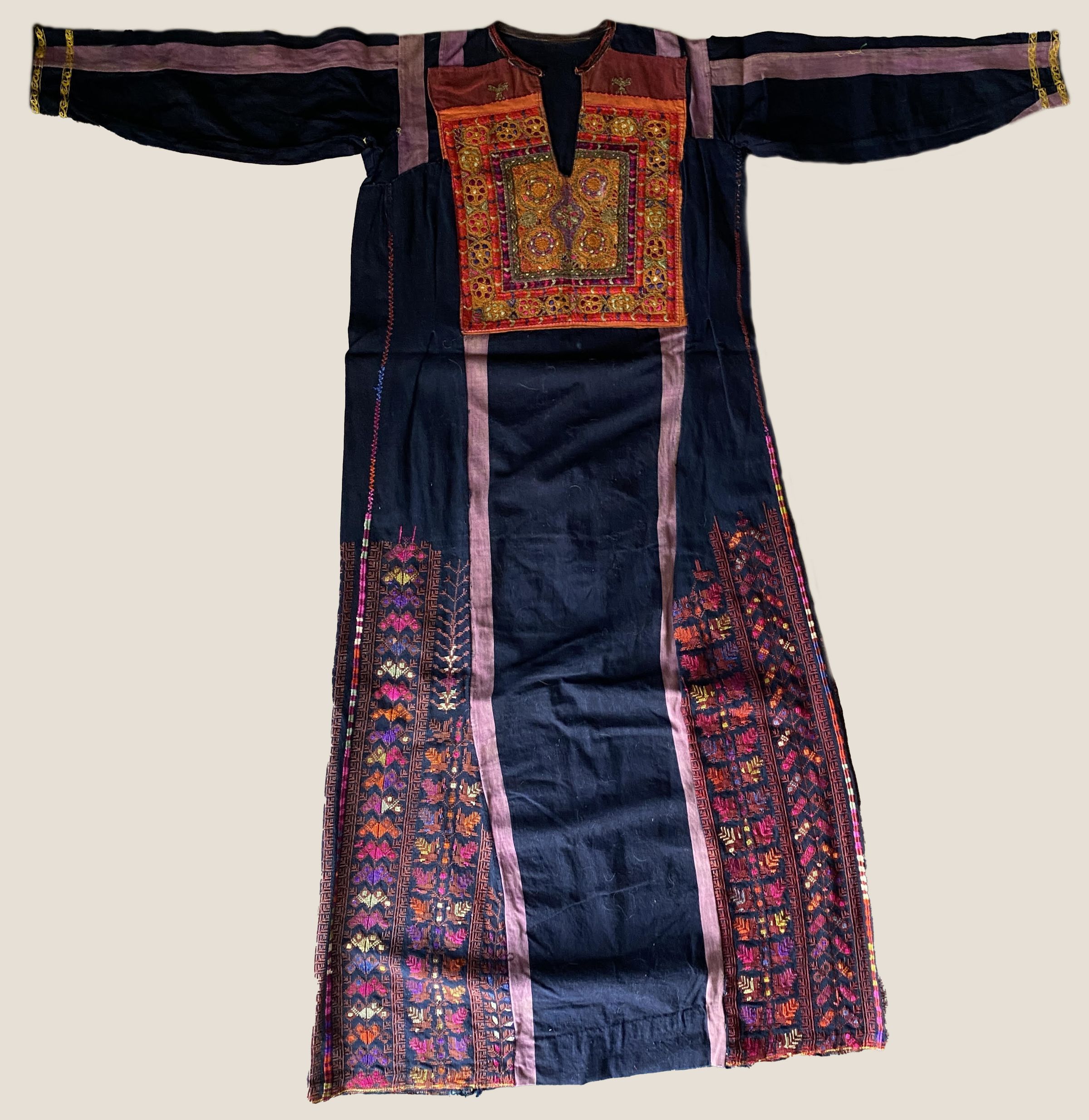 This thobe combines the chest panel of the Bethlehem thobe al-malak with the regional dress styles of Gaza, al-Ramle, and al-Khalil in the skirt and sleeves. The original Gaza dress was made in the early 20th century, and the added panels in the 1930s or 1940s. All elements came together for the sale of the dress by 1972 in Jerusalem. The sewing was done poorly, perhaps by a shopkeeper who wanted to gain maximum profit from tourists by including the treasured Bethlehem chest panel.