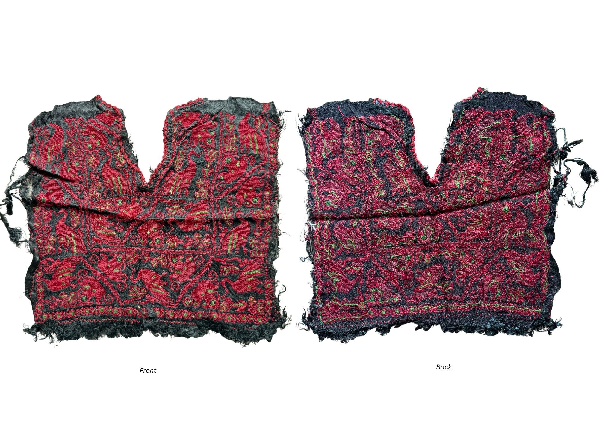 notes: The chest panel was embroidered and worn by its maker as part of a Palestinian dress before the garment was sold into the tourist market. The panel was subsequently cut from the dress and sold separately, later entering a collection in the Netherlands. It was acquired by the donor group through an online transaction in 2024 via the Facebook group "Ethnic Textiles Community."Notes