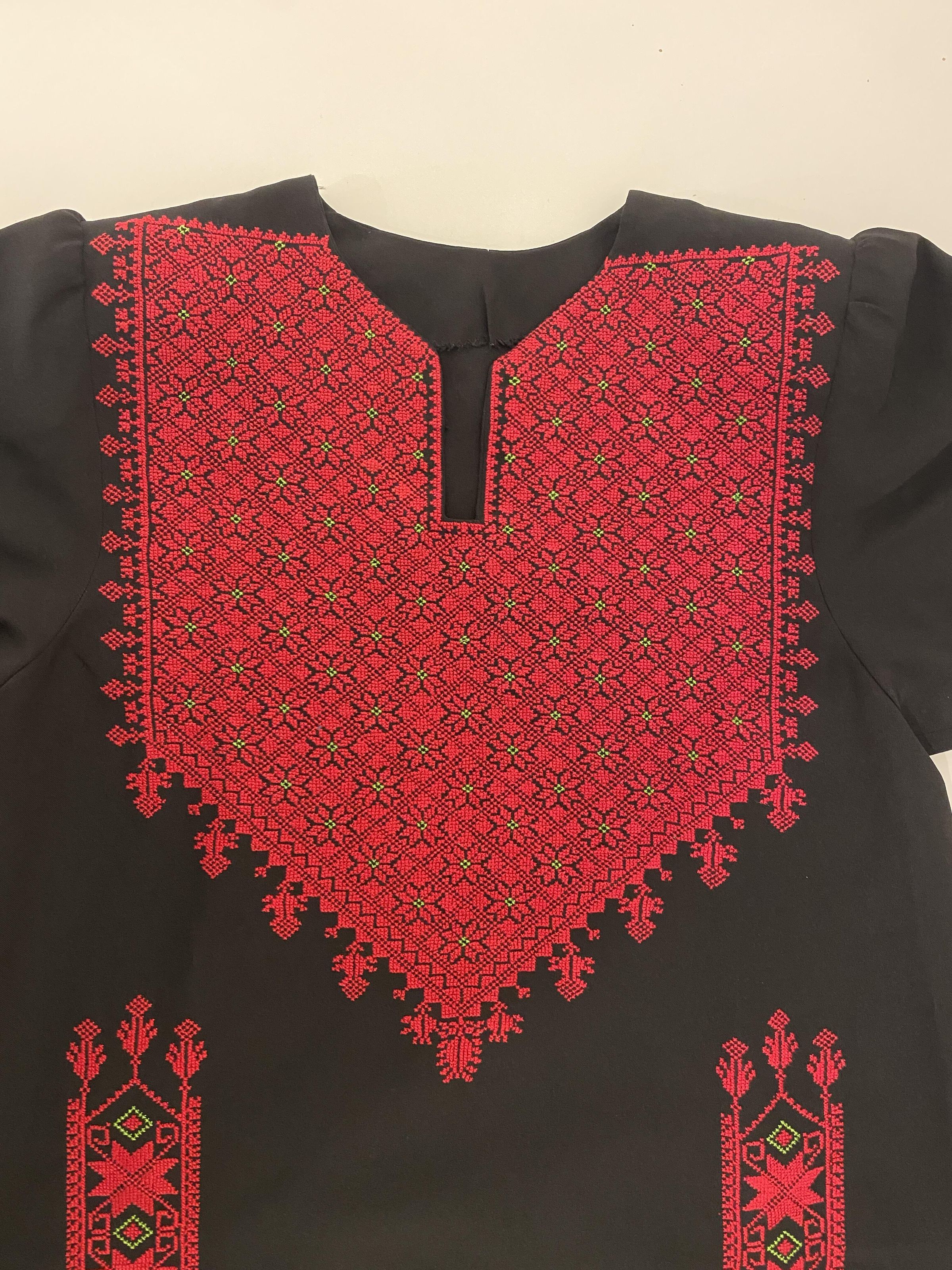 This is a contemporary dress, with shoulder pads, using traditional Palestinian cross-stitch technique, colors and patterns. Starting in the 1970's, the embroidery patterns used for Palestinian embroidered dresses (thobe), expressed a national allegiance to Palestine, rather than to a particular village or town. The motifs and style utilized in this dress, and during this time period, continue to underscore a unified Palestinian style. The dresses of the post 1948 era no longer represent the regional identity of the wearer, but a Palestinian national identity in the face of cultural erasure and appropriation.Context