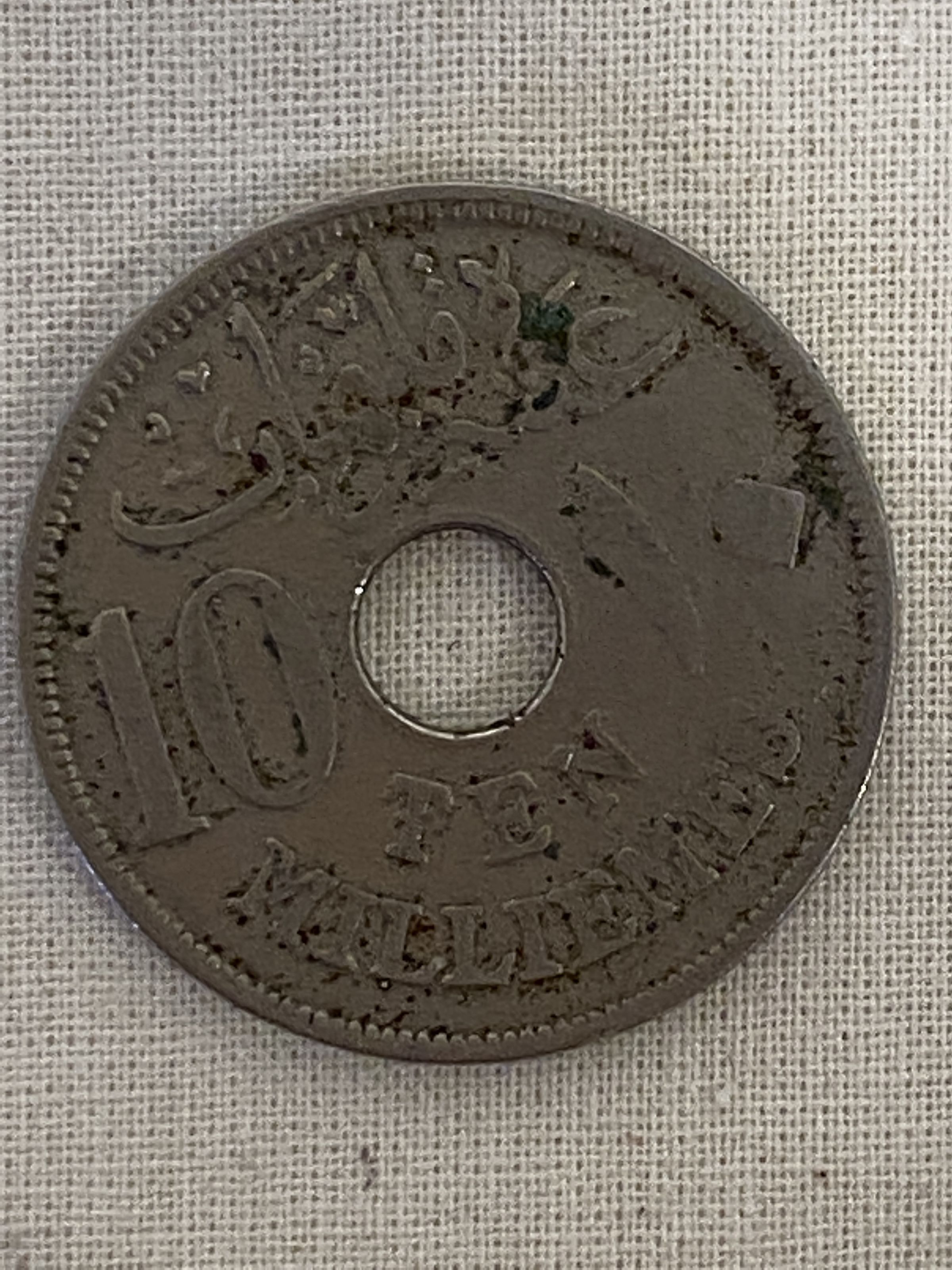 Egyptian coin. Removed from display and placed under display case in the storage compartment.Collection