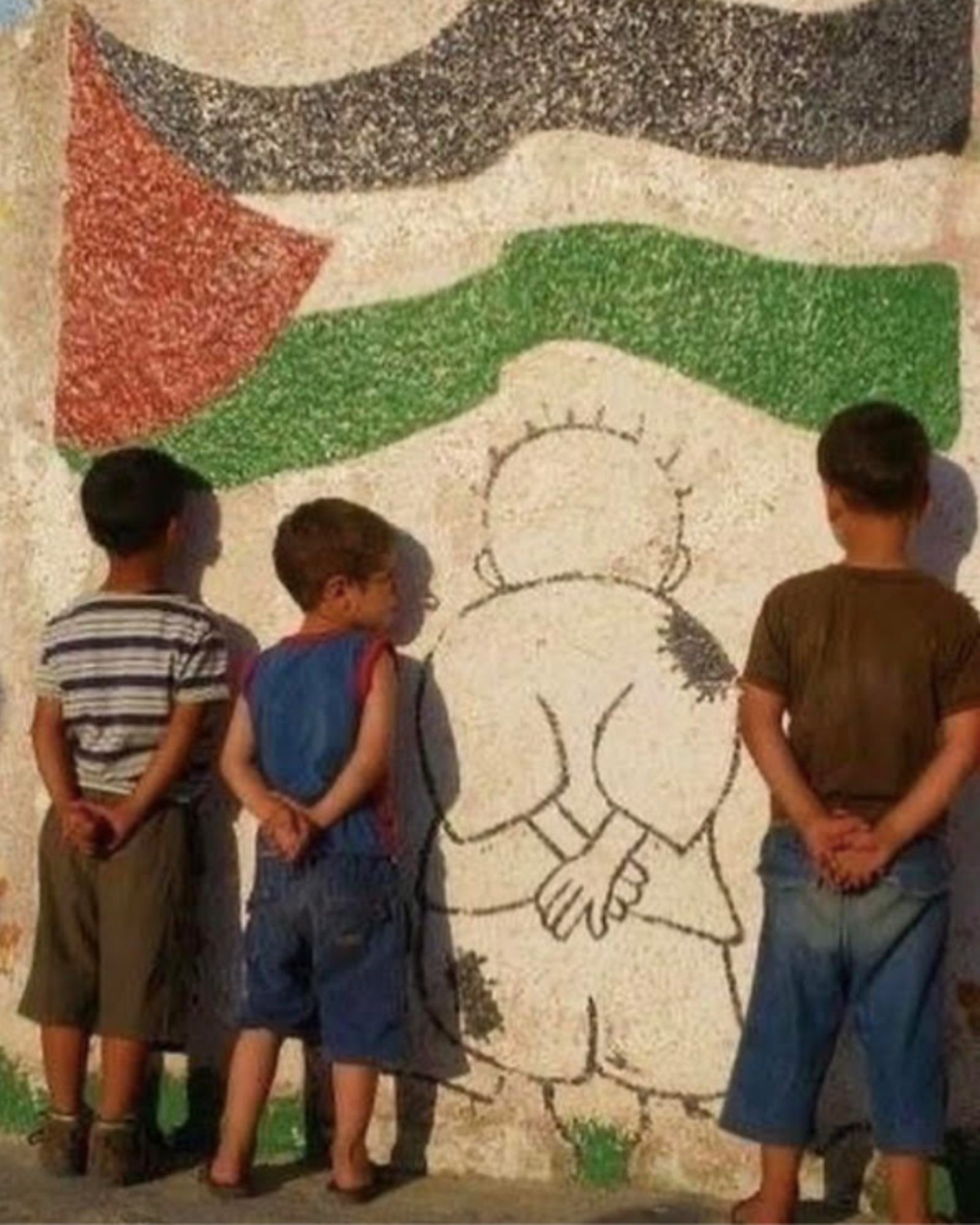 Today, the image of Handala is found in murals and graffiti art in the streets of refugee camps and occupied Palestine, as well as across the apartheid wall. In this photograph, we see three boys standing like Handala, with their arms held behind their back. Each year approximately 500-700 Palestinian children, some as young as 12 years old, are detained and prosecuted in the Israeli military court system with the most common charge being stone throwing. With their hands held behind their back, the Palestinian boys in this photograph are posing like Handala, and at the same time, clasping their hands as if they have been arrested.Copyright