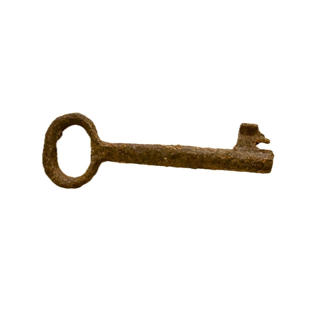 This iron key, now heavily rusted and chipped at the bit, once secured the door of a Palestinian home prior to 1948. This key is heavily rusted and degraded at the handle. It is possible that the key was chipped during the process of degradation. It is difficult to pinpoint the specific year and geography of this key, as iron keys have been used in Palestine and the broader Eastern Mediterranean for centuries, at least since the medieval period. By the 18th and 19th centuries, iron keys were standard for residential doors across rural and urban Palestine.