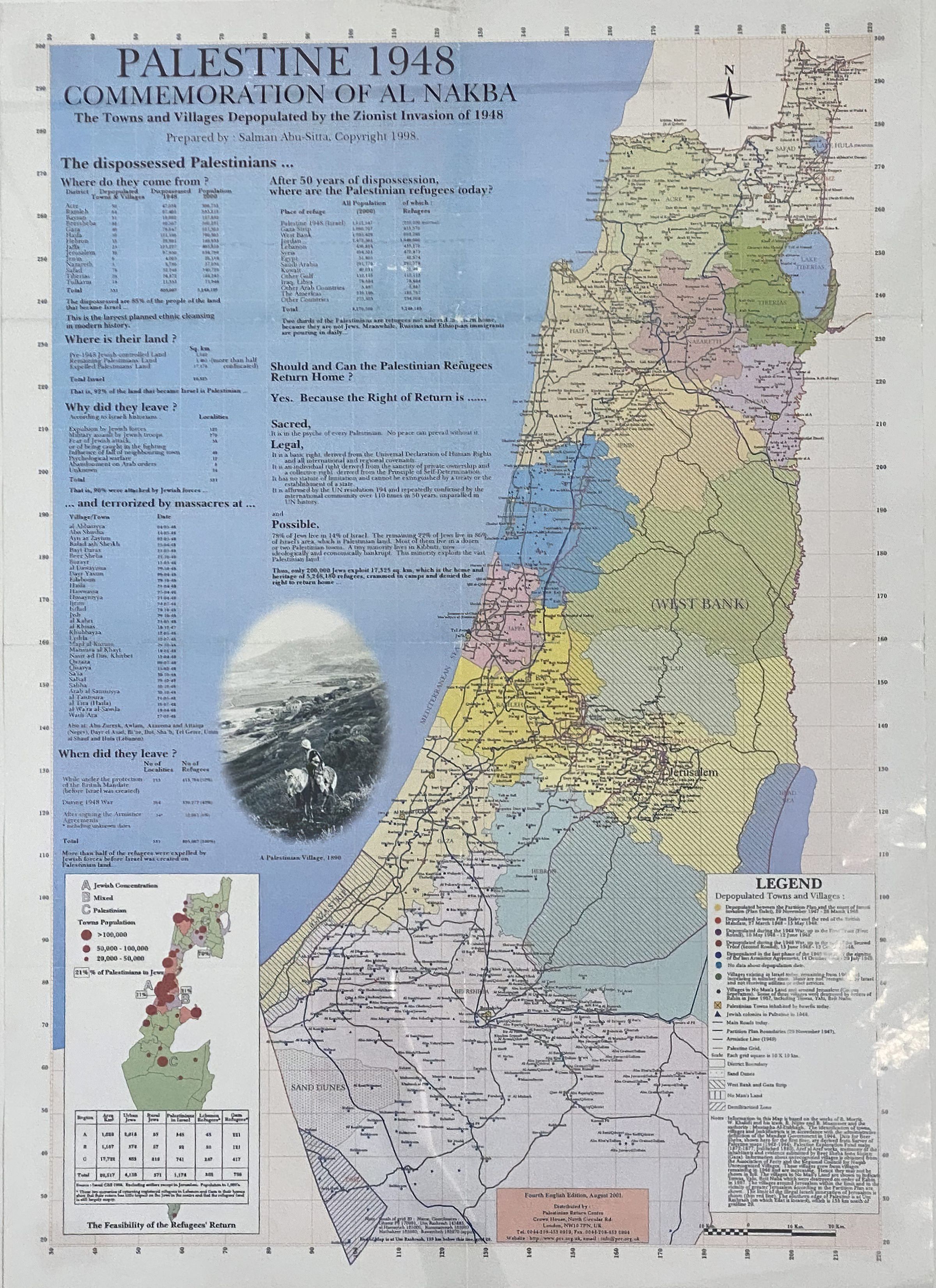 This map, prepared by Palestinian academic Salman Abu Sitta in 1998 to commemorate the 50th anniversary of Al-Nakba, shows the towns and villages depopulated by the Zionist invasion of 1948. It also lists the massacres committed in 1948, and includes statistics about the dispossessed Palestinians, such as each district's population and the count of those that fled. It analyzes demographics and concludes that the Palestinian right of return is sacred, legal, and possible.Collection