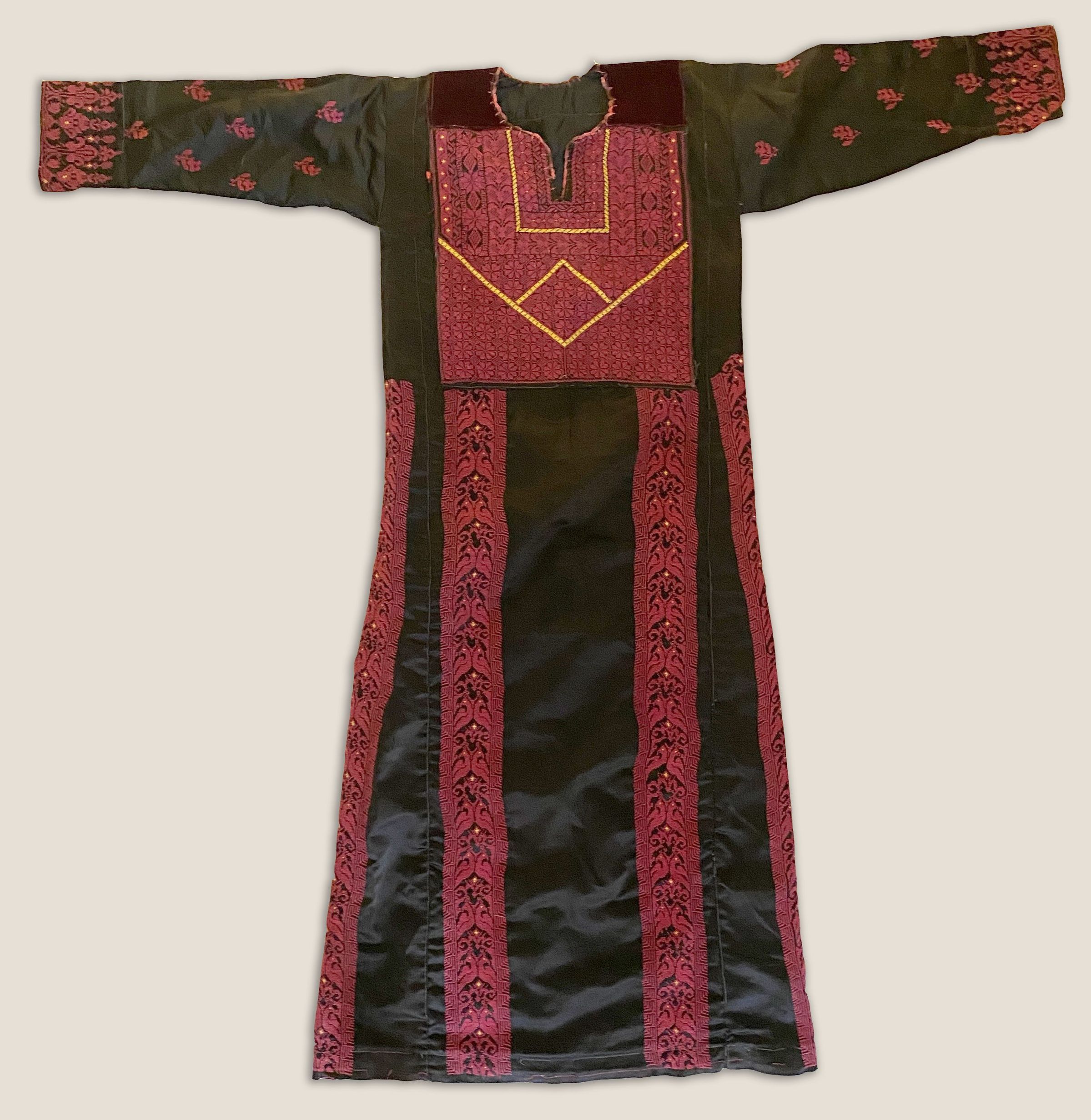 During the late 1960s, Palestinians revived the "six branch dress" style, named after the six vertical bands of embroidery that ran from waist to hem. This style of dress had been practiced prior to 1948 using traditional motifs that represented village styles. However, its reemergence during the mid-twentieth century showcased curvilinear motifs or branches of birds, as shown in this dress. In its widespread popularity during the 1960s, this dress became the first post-1948 style to evolve without being tied to an established regional style. The patterns in the “branches” were primarily European, however the style grew over the decades to include more traditional motifs. The beauty of the "six branch dress" was that the design structure allowed one to embroider the "branches" to reflect one's own economic necessities: very thin if times were hard, broadening the panels as small luxuries became possible.Context