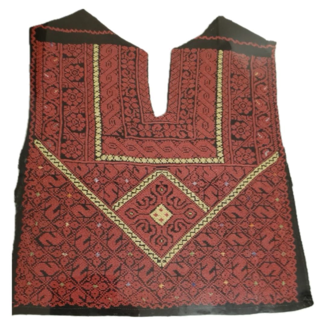 This is a contemporary chest panel of a six branch dress, most likely produced during the 1980s or 1990s. In Palestinian culture, it is and was frowned upon to discard of embroidery even when the rest of the dress was in tatters. Palestinian women cut the embroidered fabric sections and repurposed them for pillowcases, or framed it, as with this piece.