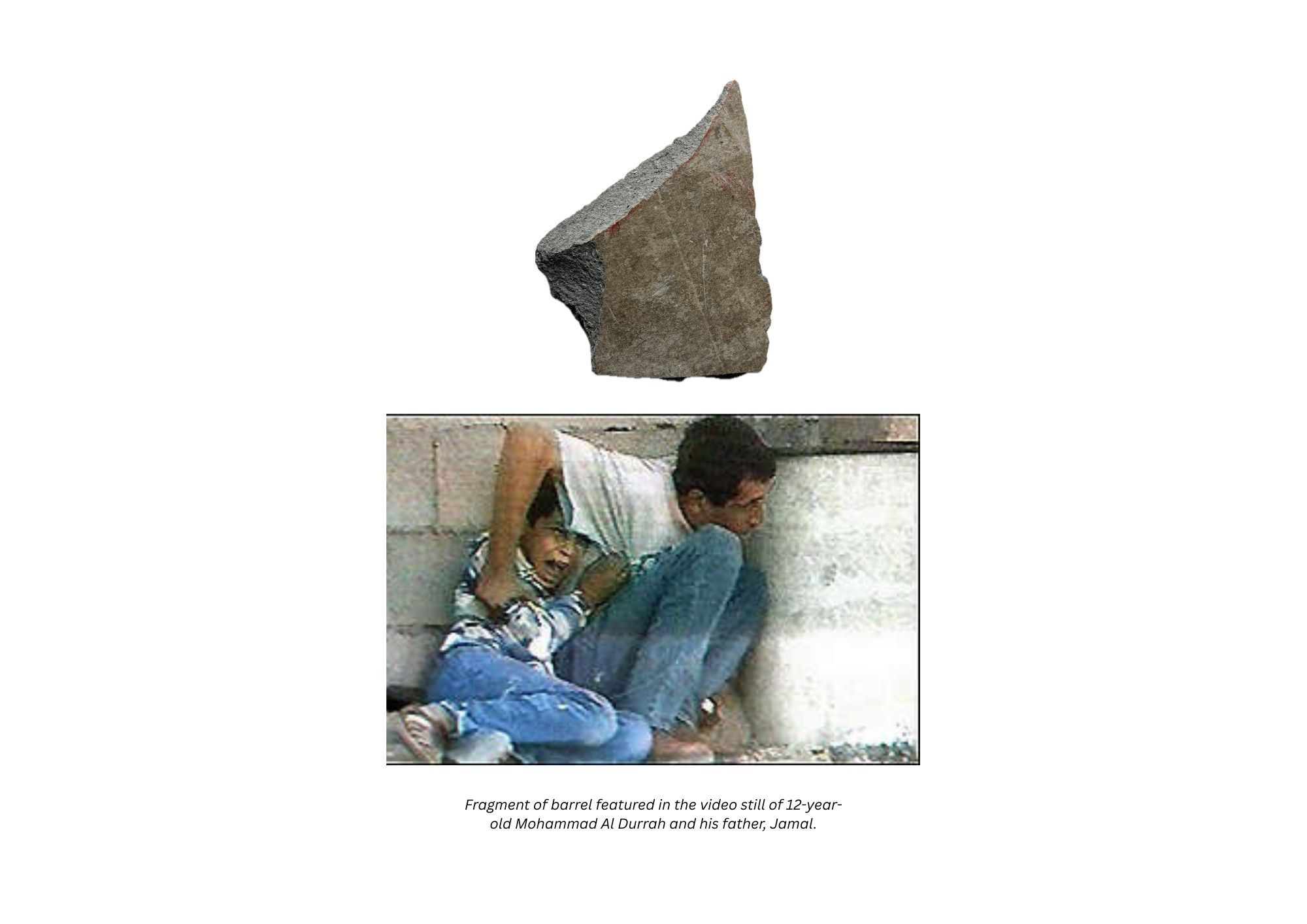 The day after the killing, donor Tom Getman stood at the site and watched the Israeli forces destroy physical evidence. He collected part of the ruptured barrel behind which the father and son had taken shelter before it was removed. That fragment, preserved in the museum, stands as evidence at the scene of Mohammad's tragic killing.Collection