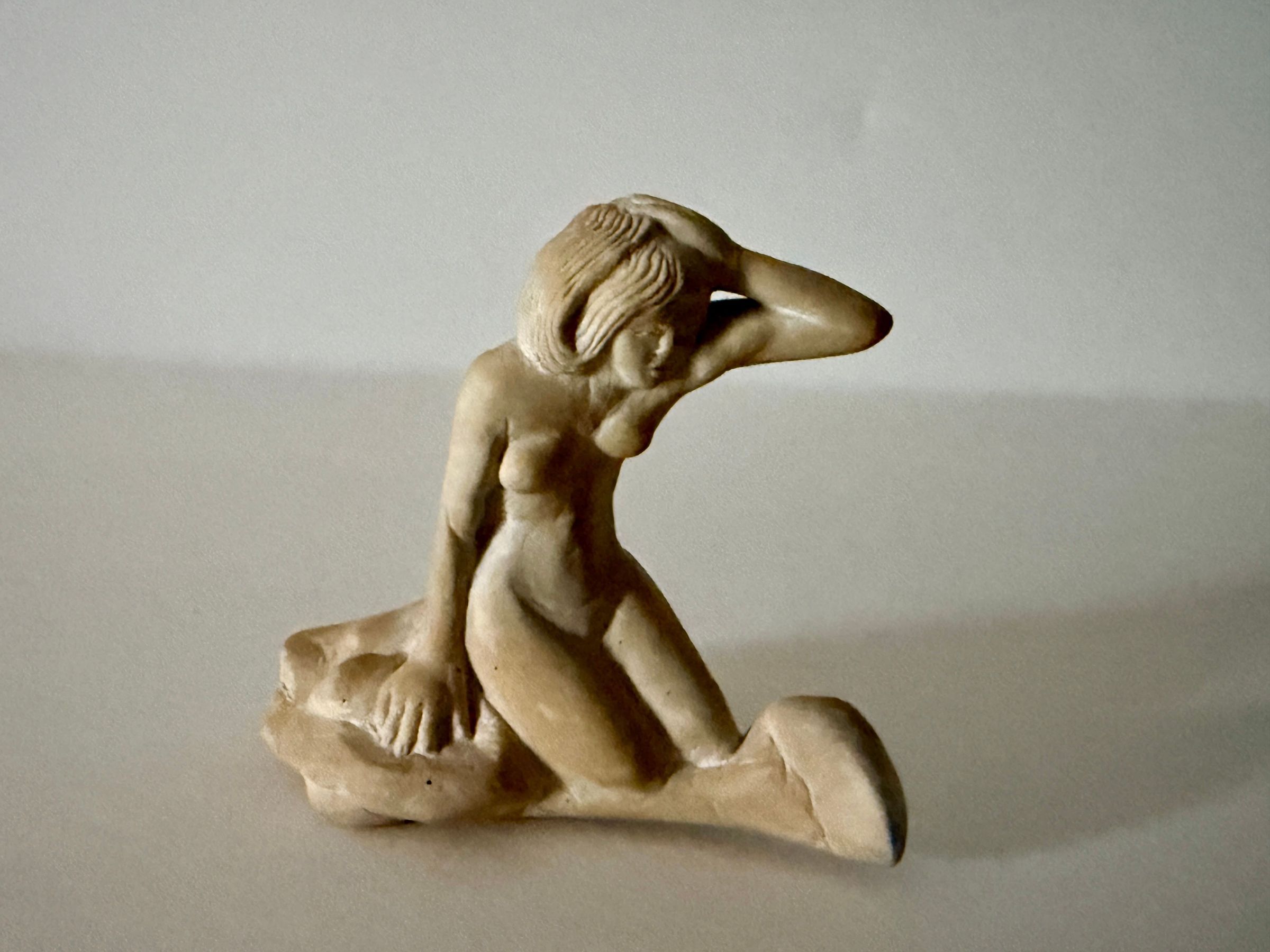 The figure was carved by a Palestinian detainee who told donor Marcia Stone that he shaped the sculpture from a stone he picked up inside the camp, carving it entirely with a Bic pen, using the hardened metal tip of the pen to scrape, score, and incise the stone over time. The resulting figure depicts a seated woman with her hand lifted across her brow, her form leaning forward in a gesture that could be read as modesty, contemplation, or simply the expressive posture that was allowed by the shape of the stone. In the museum display case, the sculpture rotates on its mount independently and often turns to face the mirror at the back of the case. Whether this recurring orientation is coincidence, balance, modesty, or vanity remains unknown.